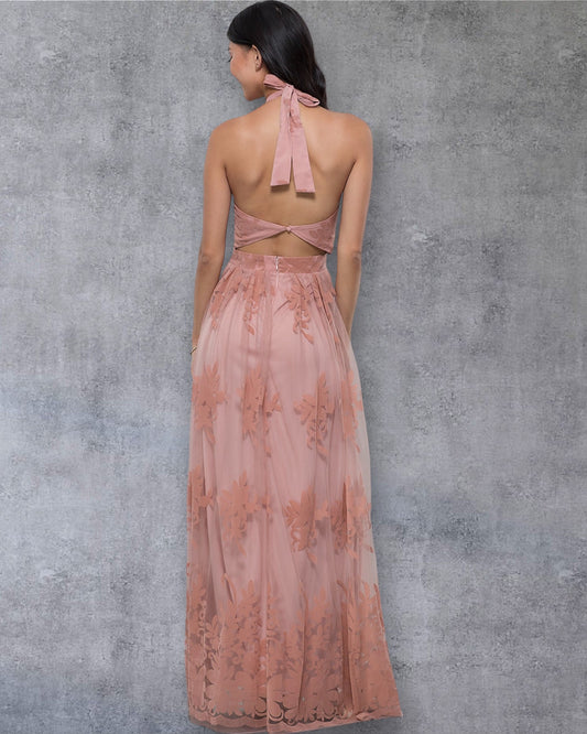 Vestido Largo de Fiesta con Escote Halter en Tono Crema