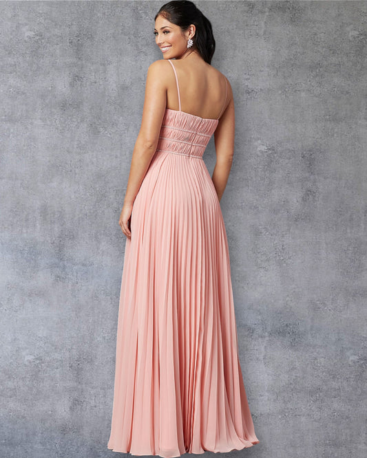 Vestido Largo Plisado en Rosa con Escote Profundo