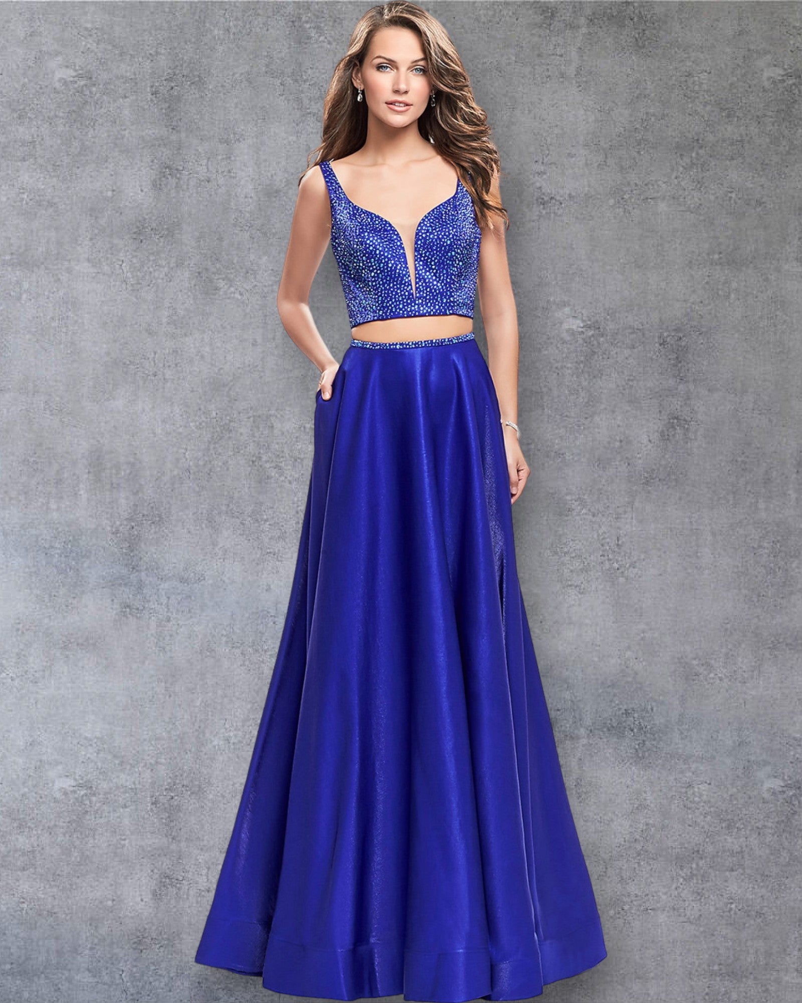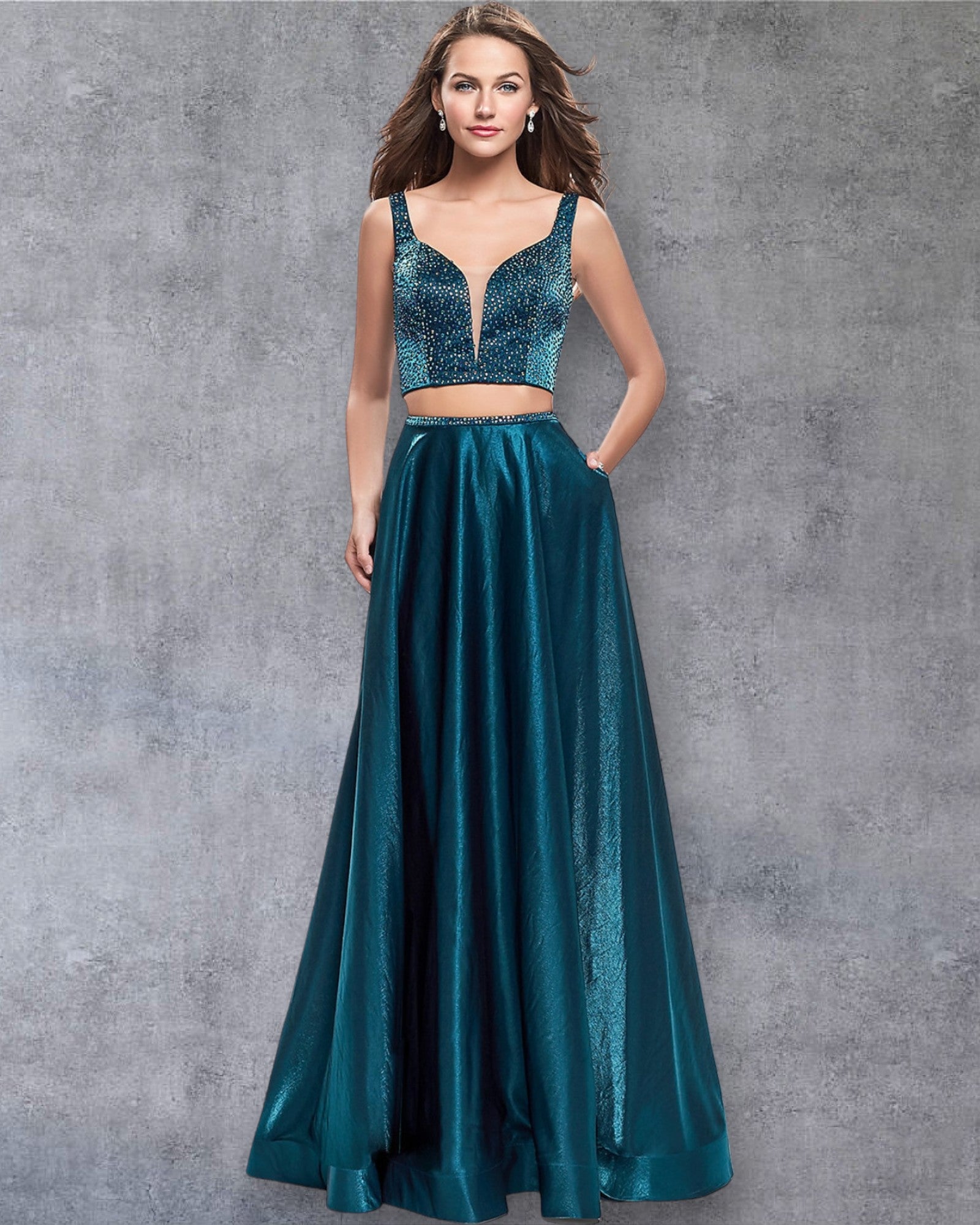 Destaca en cualquier ocasión especial con este espectacular conjunto de fiesta de dos piezas. El top, adornado con pedrería brillante, cuenta con un escote profundo en forma de corazón que resalta la figura, mientras que la falda larga y fluida, confeccionada en un tejido satinado, añade un toque de elegancia. Con una cintura alta y bolsillos funcionales, este conjunto es perfecto para una quinceañera moderna o una invitada de gala que busca comodidad sin renunciar al glamour. Disponible en deslumbrantes tonos azul marino y azul real, este diseño te asegura un look fresco y sofisticado.