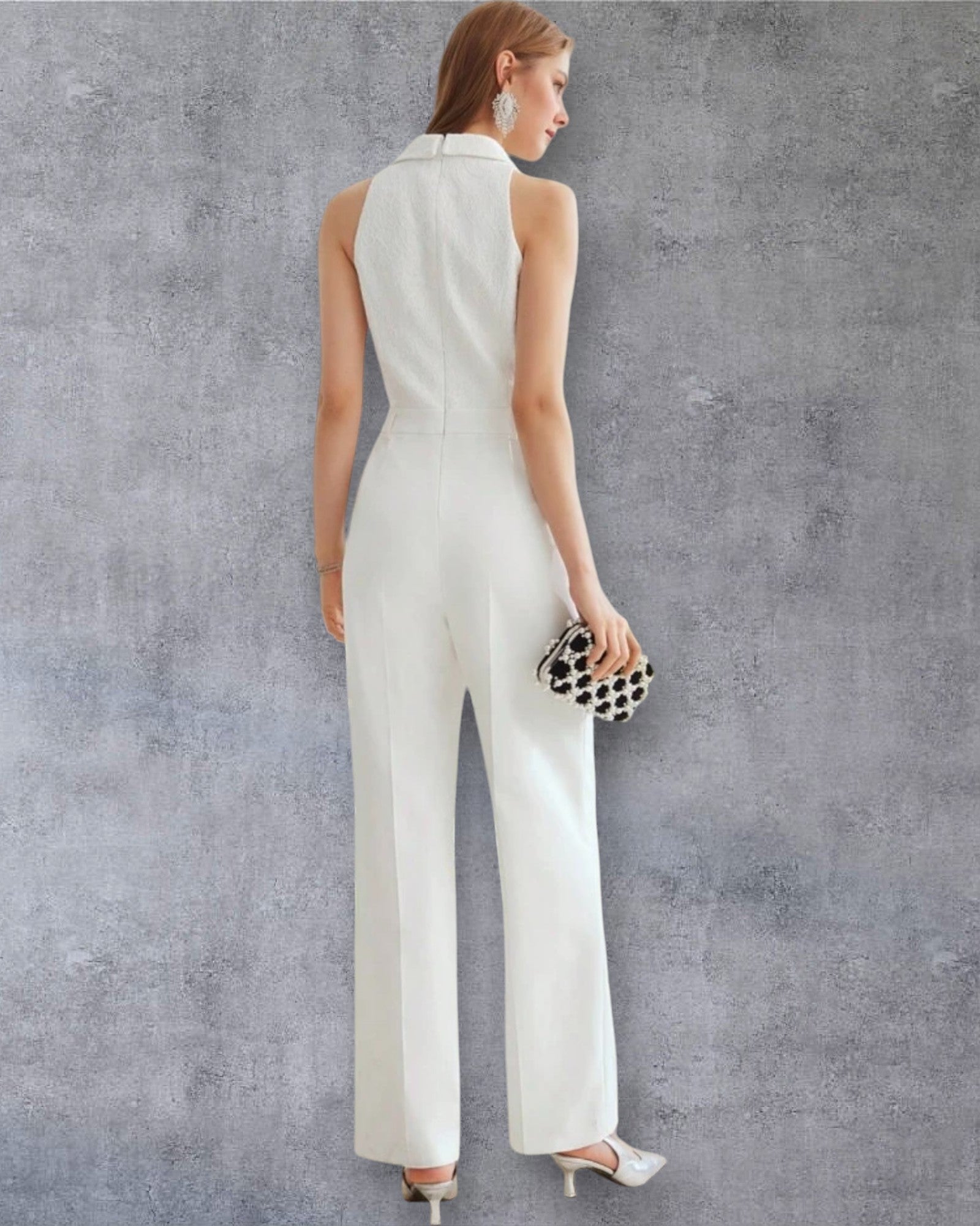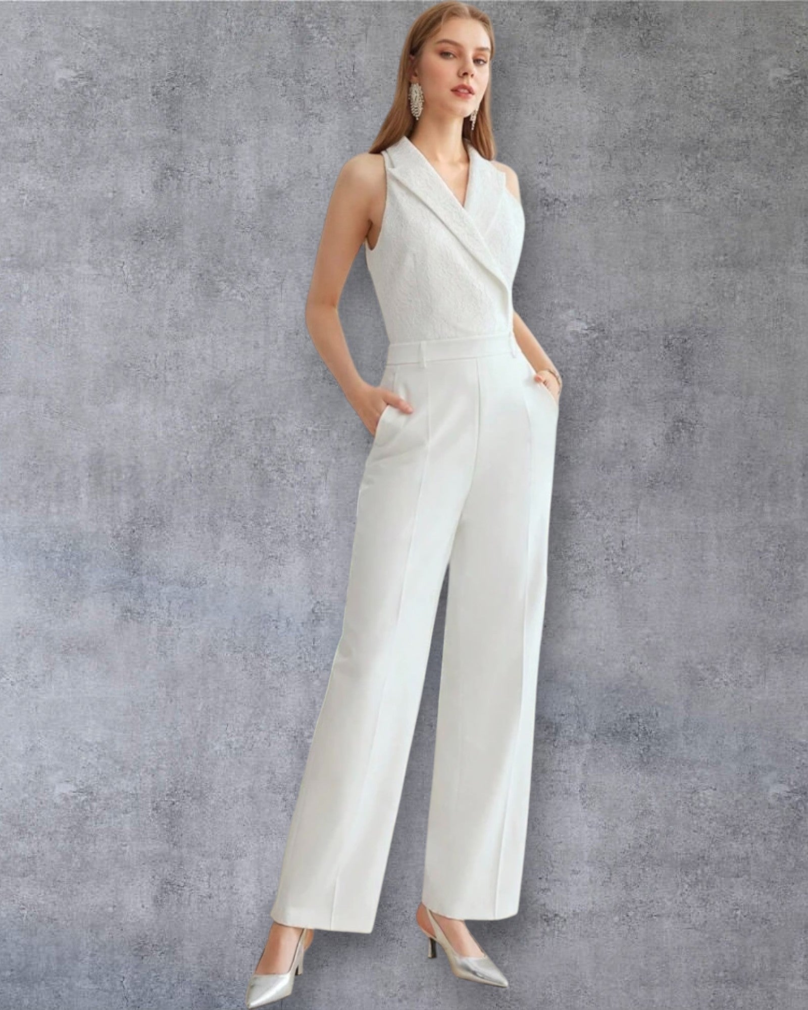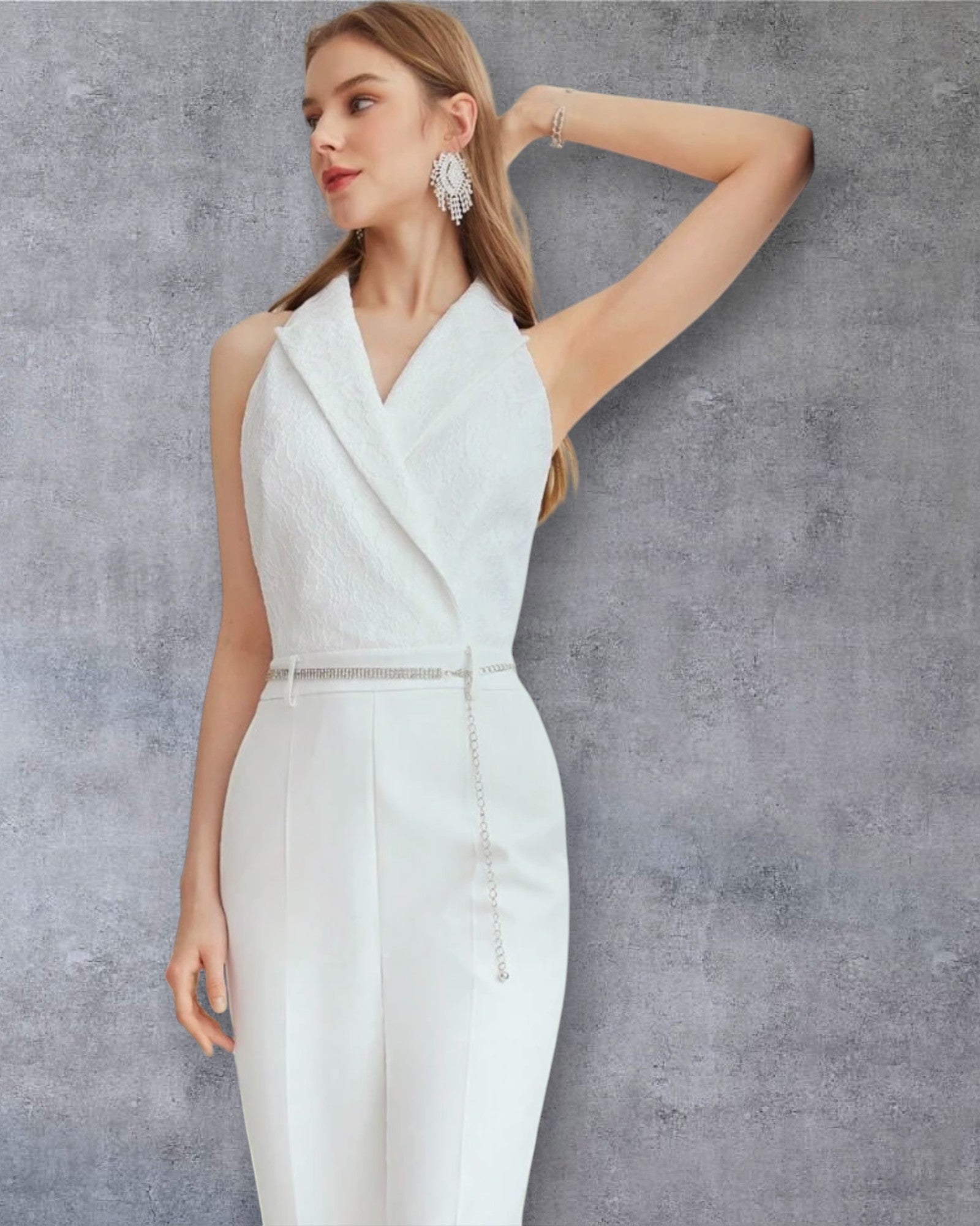 Rompe esquemas y deslumbra con este sofisticado jumpsuit blanco, perfecto para novia civil, fiesta de compromiso o cualquier ocasión especial.