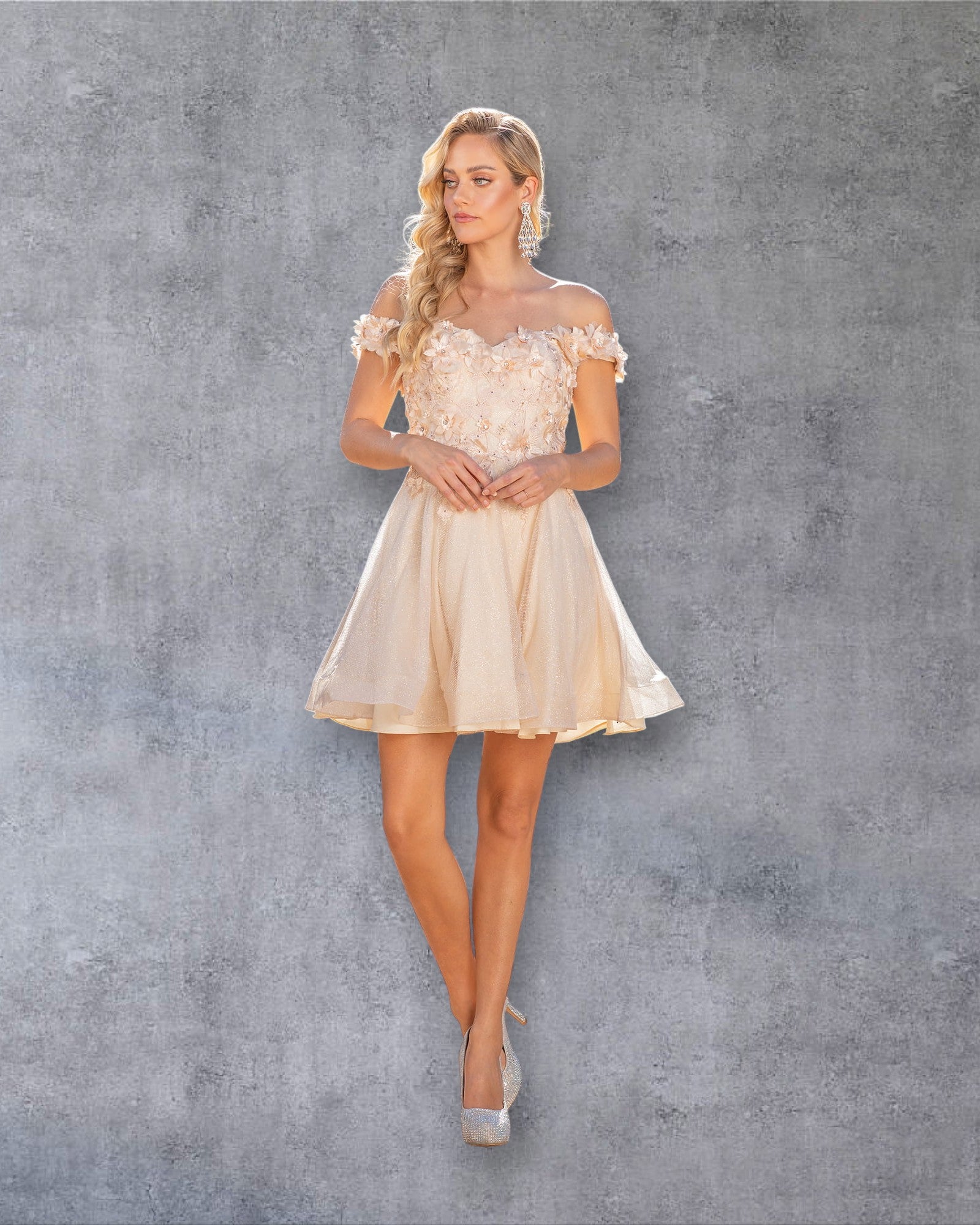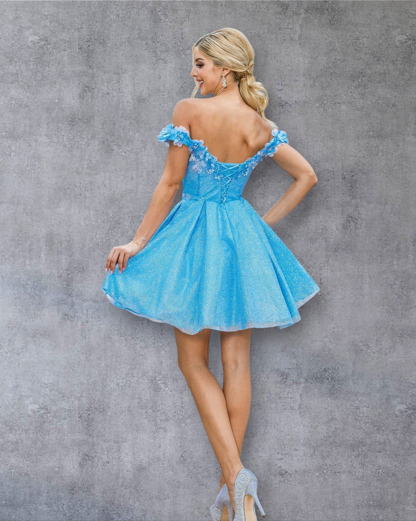 Vestido brillante de corte A con apliques florales y mangas con hombros descubiertos para el regreso a casa.