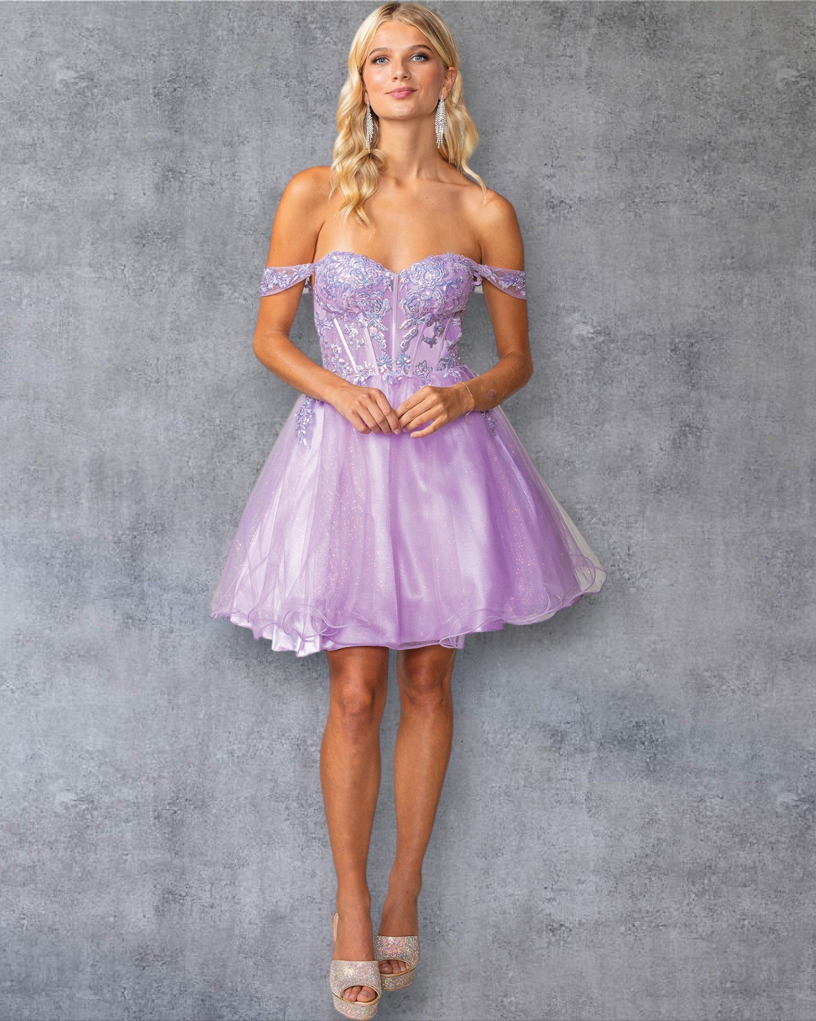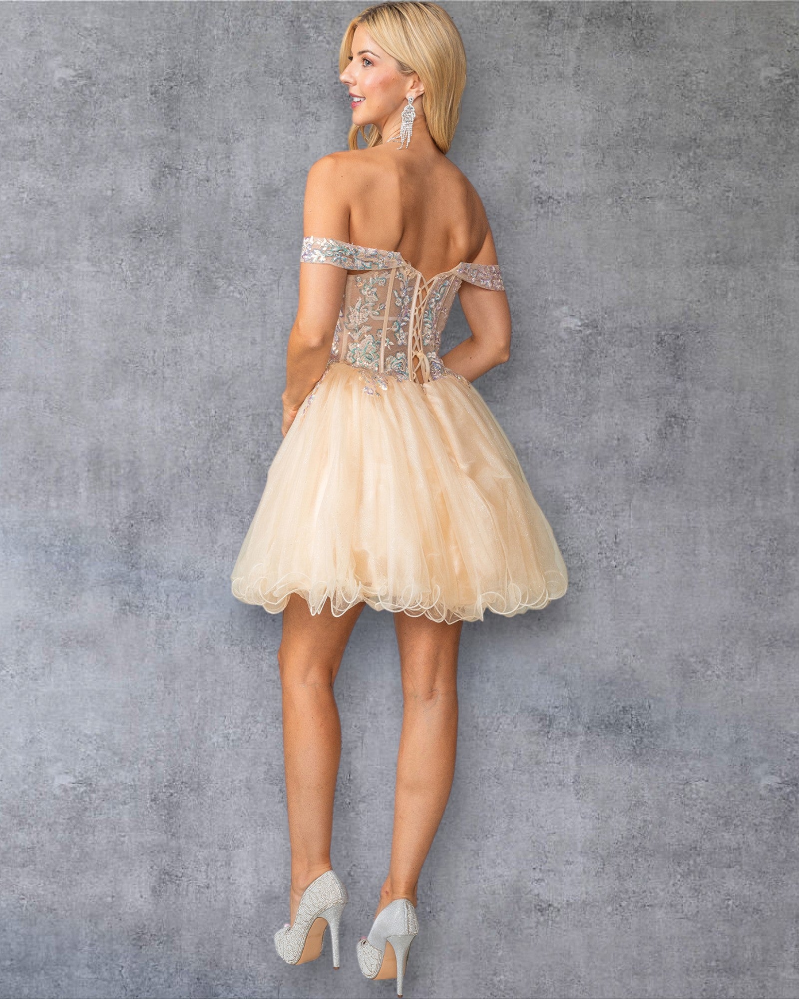 Vestido con apliques de encaje y cuentas, mangas transparentes con hombros descubiertos y falda de tul