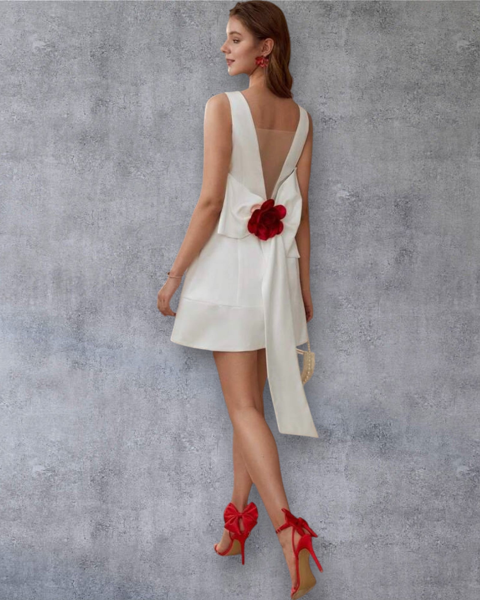 Romántico y elegante, este vestido corto en tono blanco es la elección perfecta para un evento especial. Con un diseño minimalista en el frente y un espectacular detalle en la espalda: un lazo estructurado con una flor roja que aporta un toque de sofisticación y feminidad. Su corte recto, escote cerrado y espalda en tul transparente crean un balance perfecto. Ideal para novias civiles, graduaciones o eventos donde quieras destacar con estilo único.