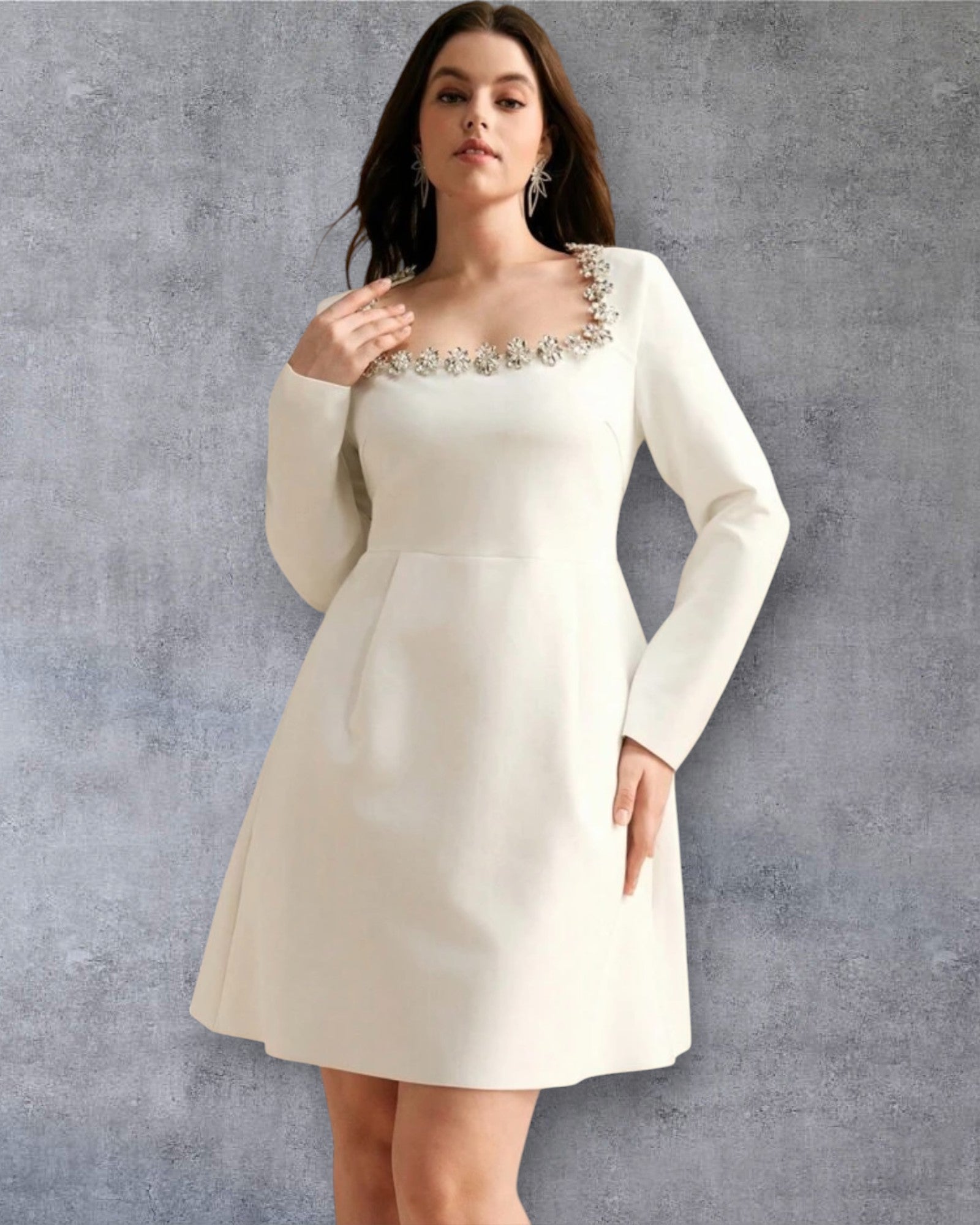 Deslumbra en tu próximo evento con este elegante vestido corto blanco. Diseñado con una silueta de línea A que favorece la figura, presenta mangas largas y un sofisticado escote cuadrado decorado con apliques florales de pedrería que aportan un toque de brillo y distinción. Su confección estructurada asegura un ajuste perfecto, mientras que el detalle de la espalda mantiene la estética limpia y moderna. Ideal para civil, cócteles, graduaciones o celebraciones especiales donde quieras lucir única y radiante.