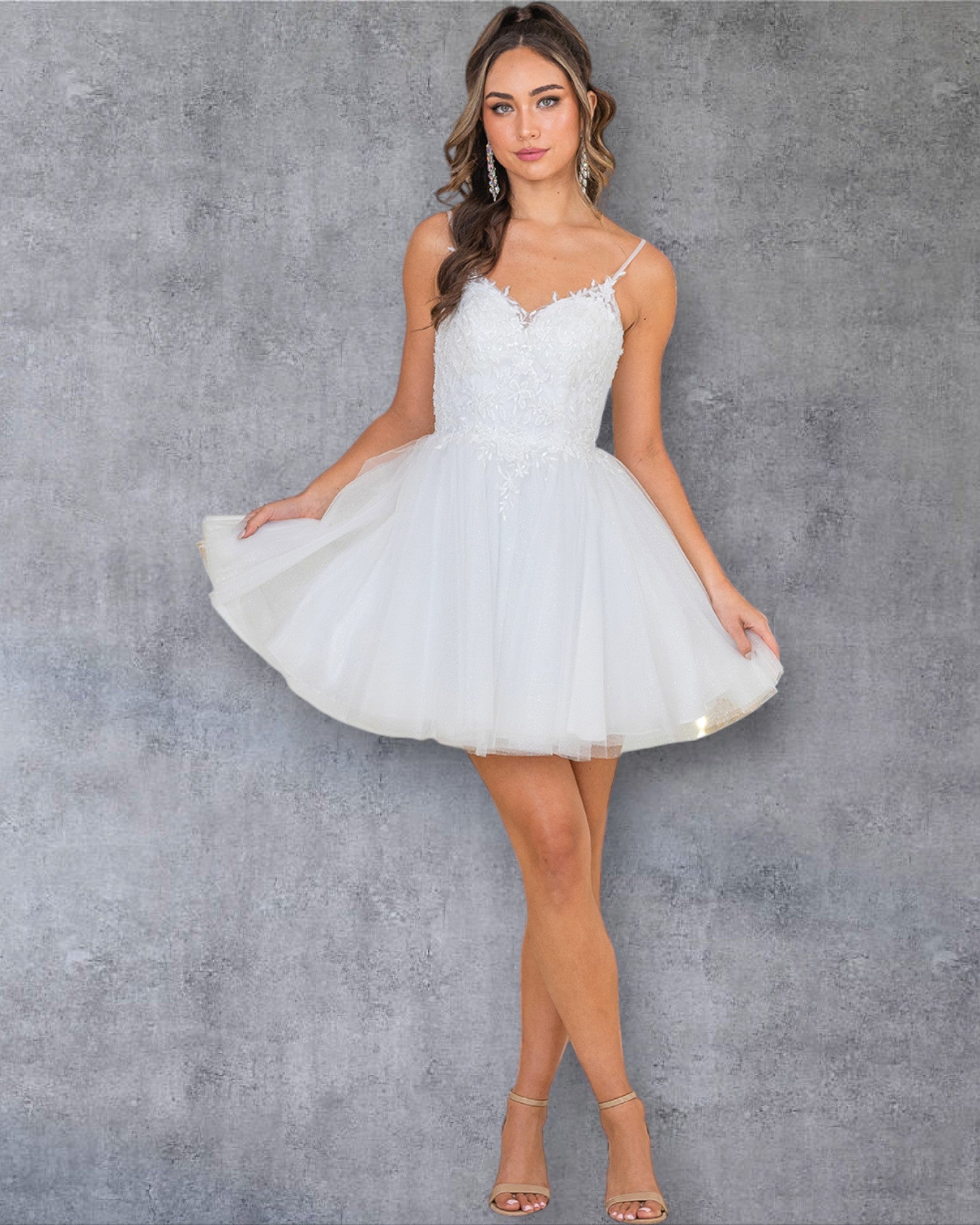 Vestido corto de fiesta con tirantes finos, corpiño de encaje con cuentas y falda de tul