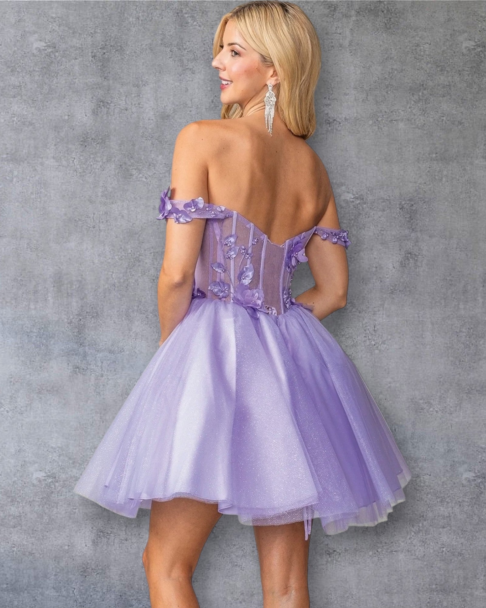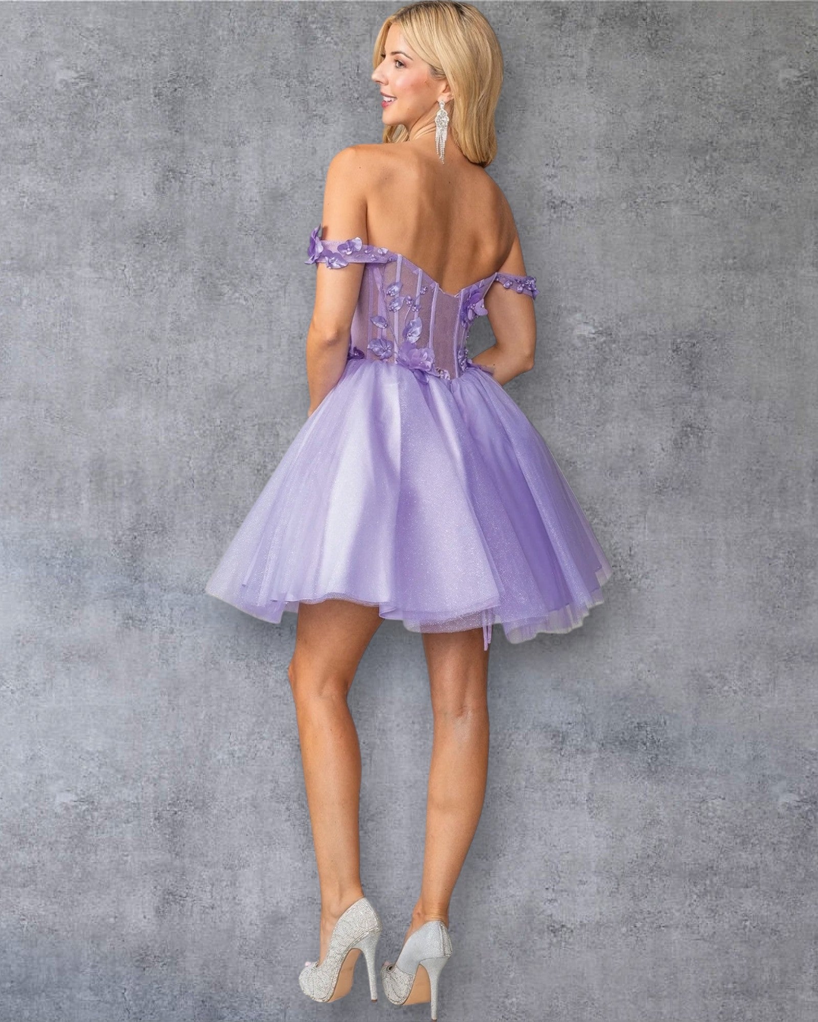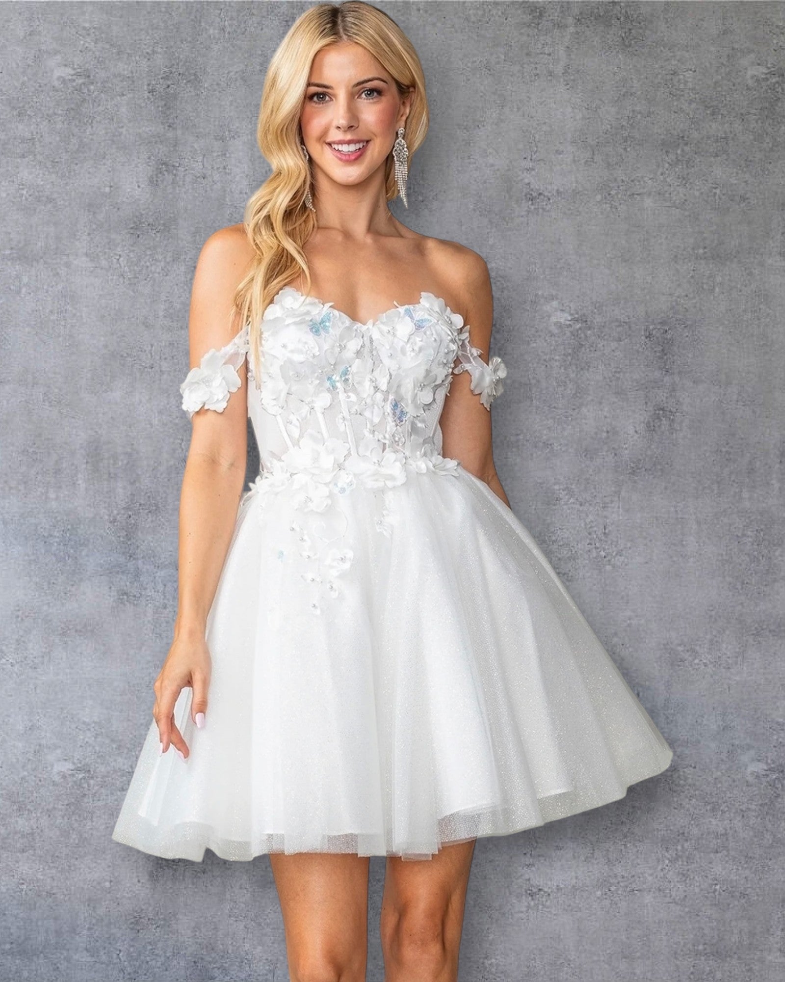 Vestido Corto de Quinceañera con Apliques Florales y Tul Brillante