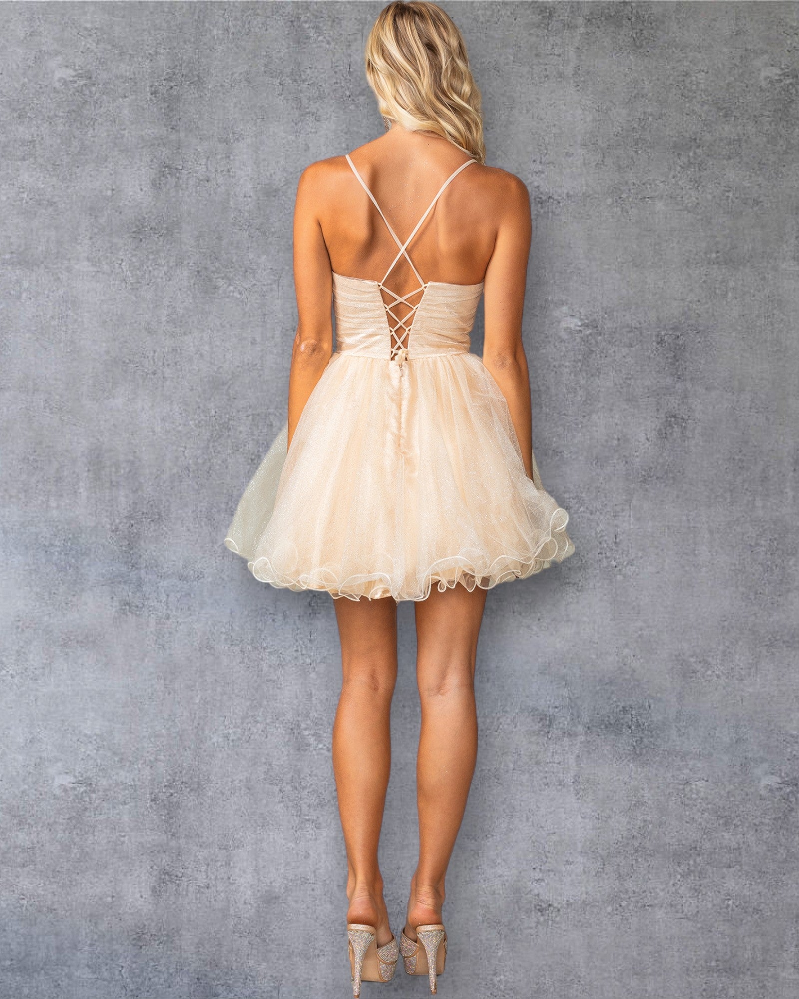 Vestido corto de tul brillante con tirantes finos y espalda cruzada con cordones