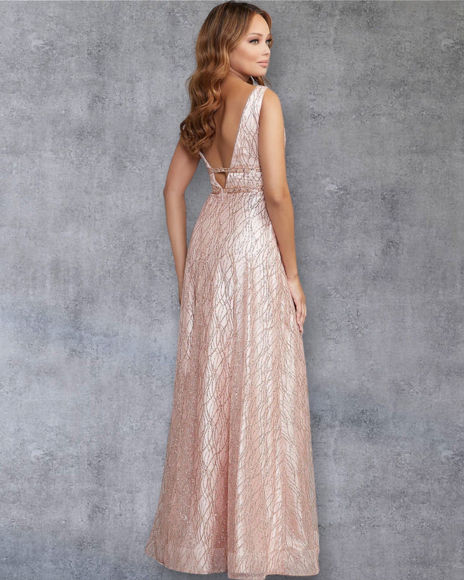 Este vestido de fiesta largo es una declaración de elegancia y estilo. Con un escote profundo en V que realza la figura y detalles metalizados en tonos rosados, es perfecto para deslumbrar en cualquier ocasión especial. La cintura está sutilmente decorada con un cinturón delgado, mientras que la falda fluida aporta movimiento y sofisticación. Ideal bodas o eventos de gala, este vestido combina feminidad y modernidad, resaltando tu estilo único. El diseño de espalda abierta añade un toque atrevido y chic para una entrada inolvidable.