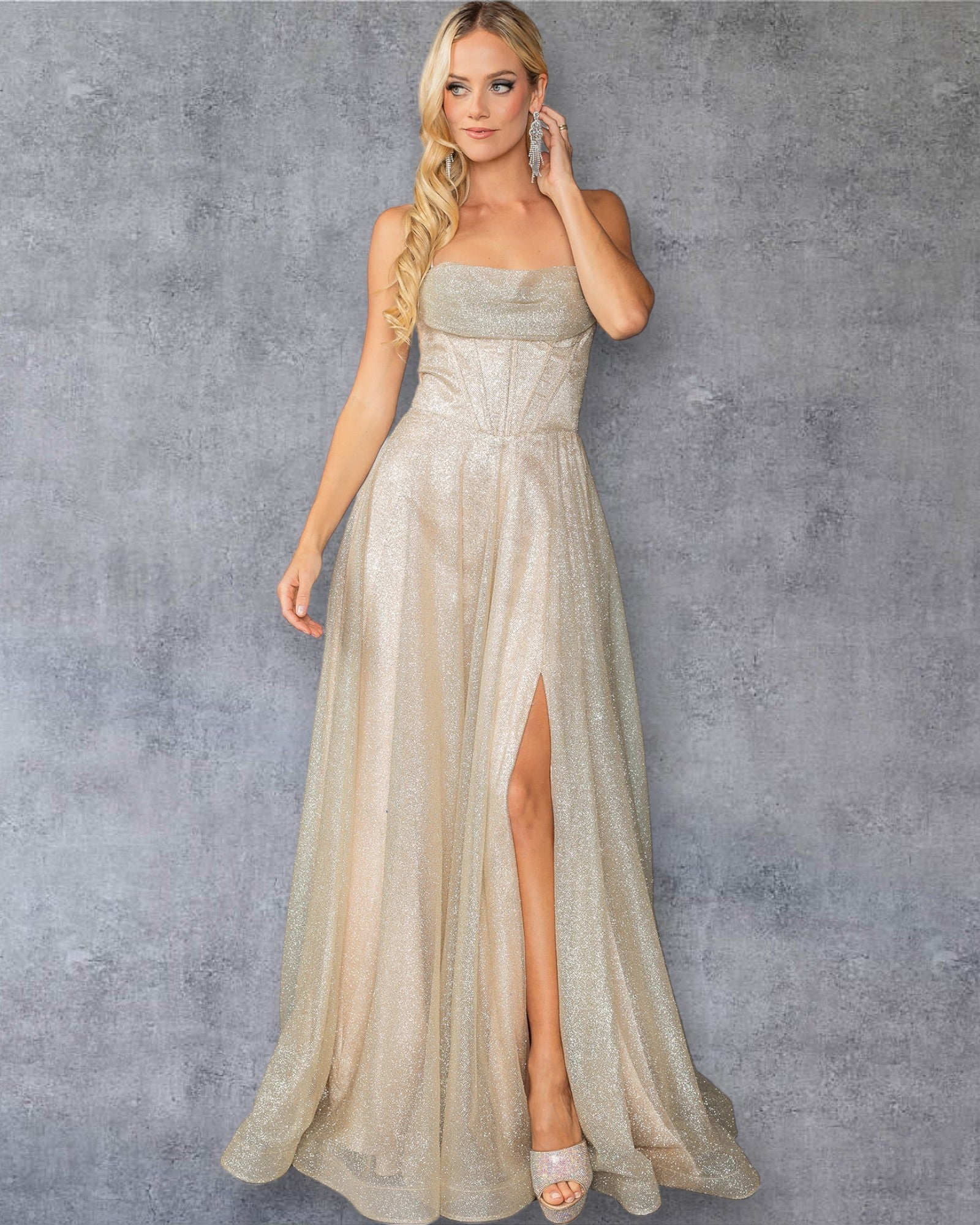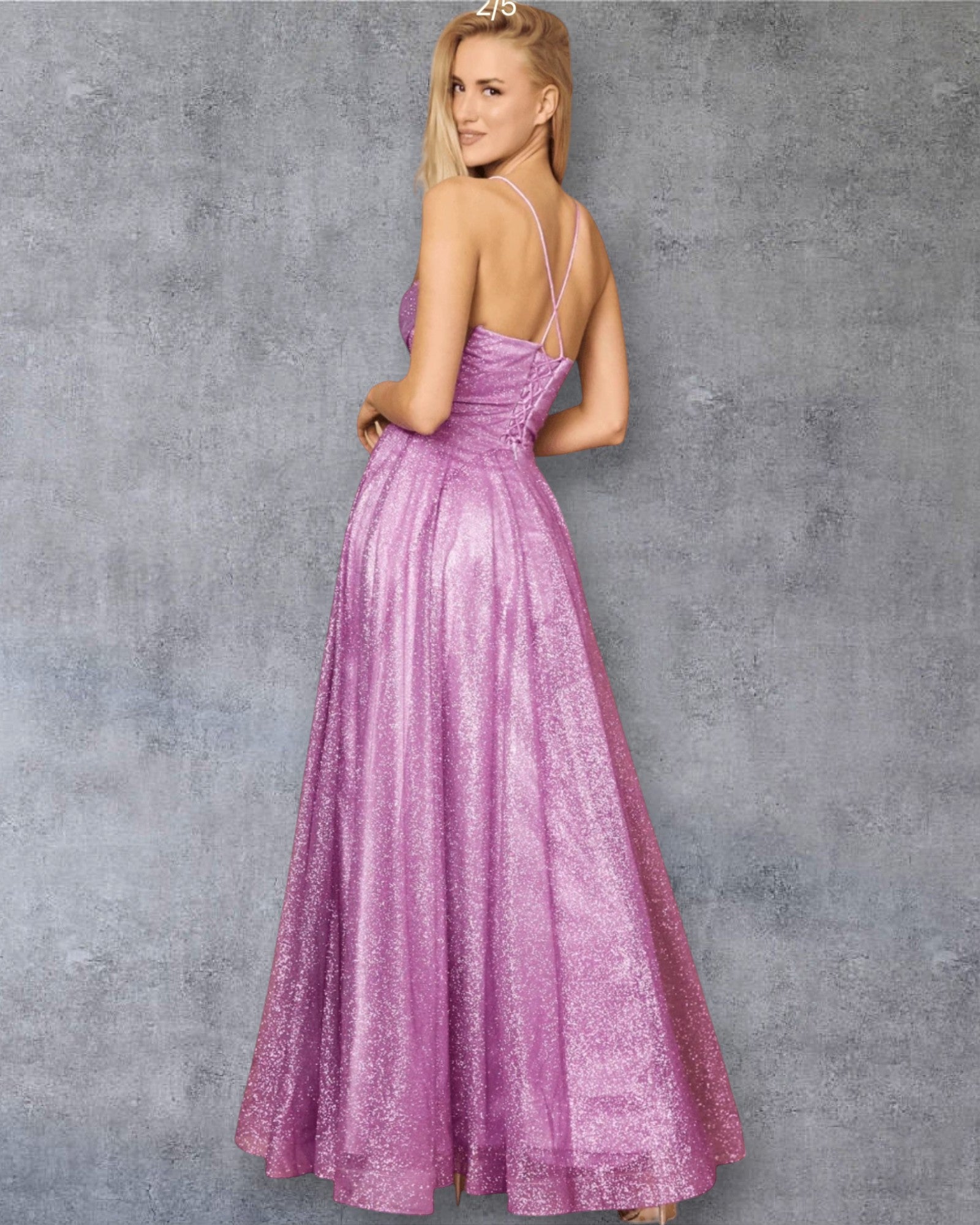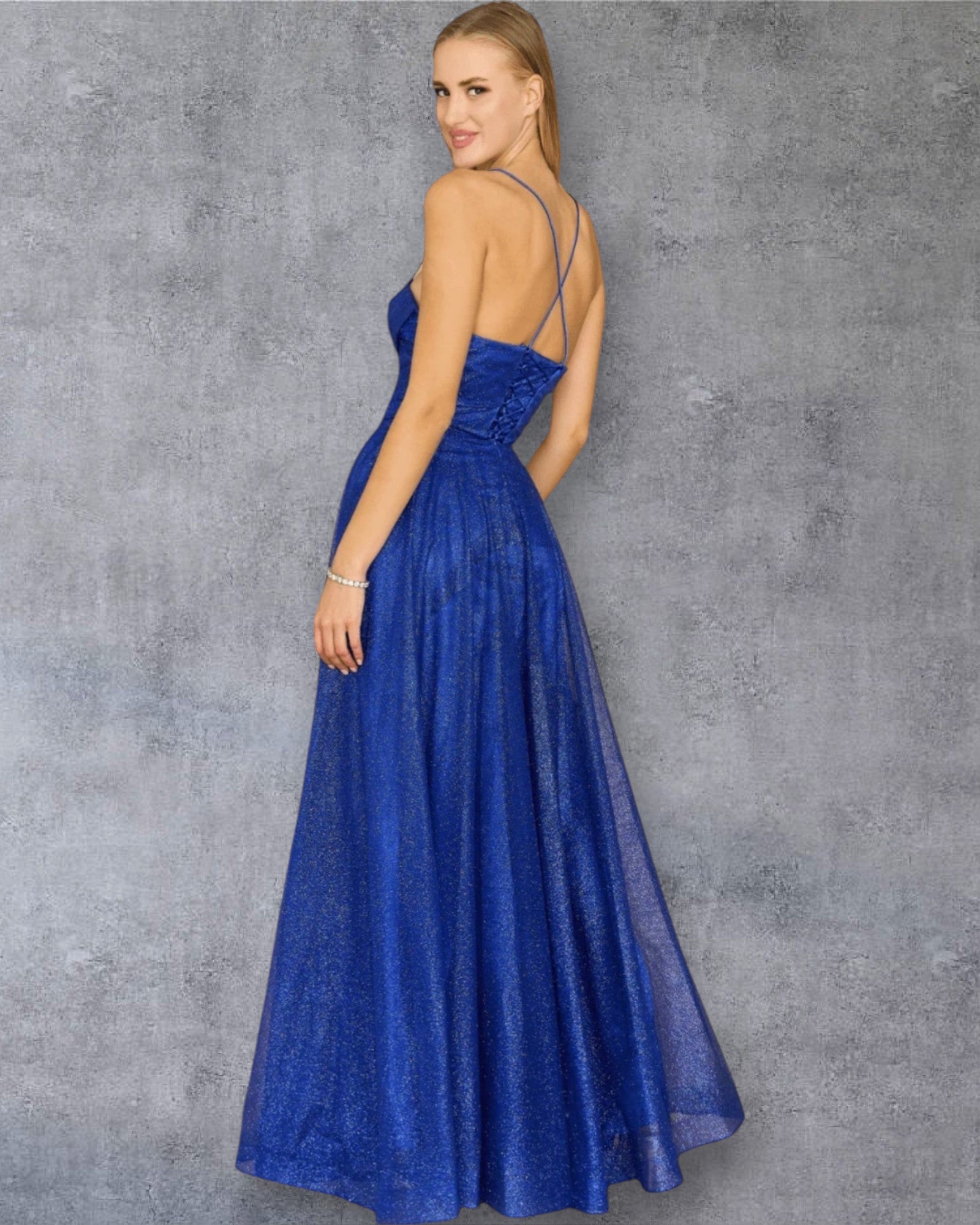 Vestido de fiesta brillante de corte A con espalda cruzada y abertura lateral