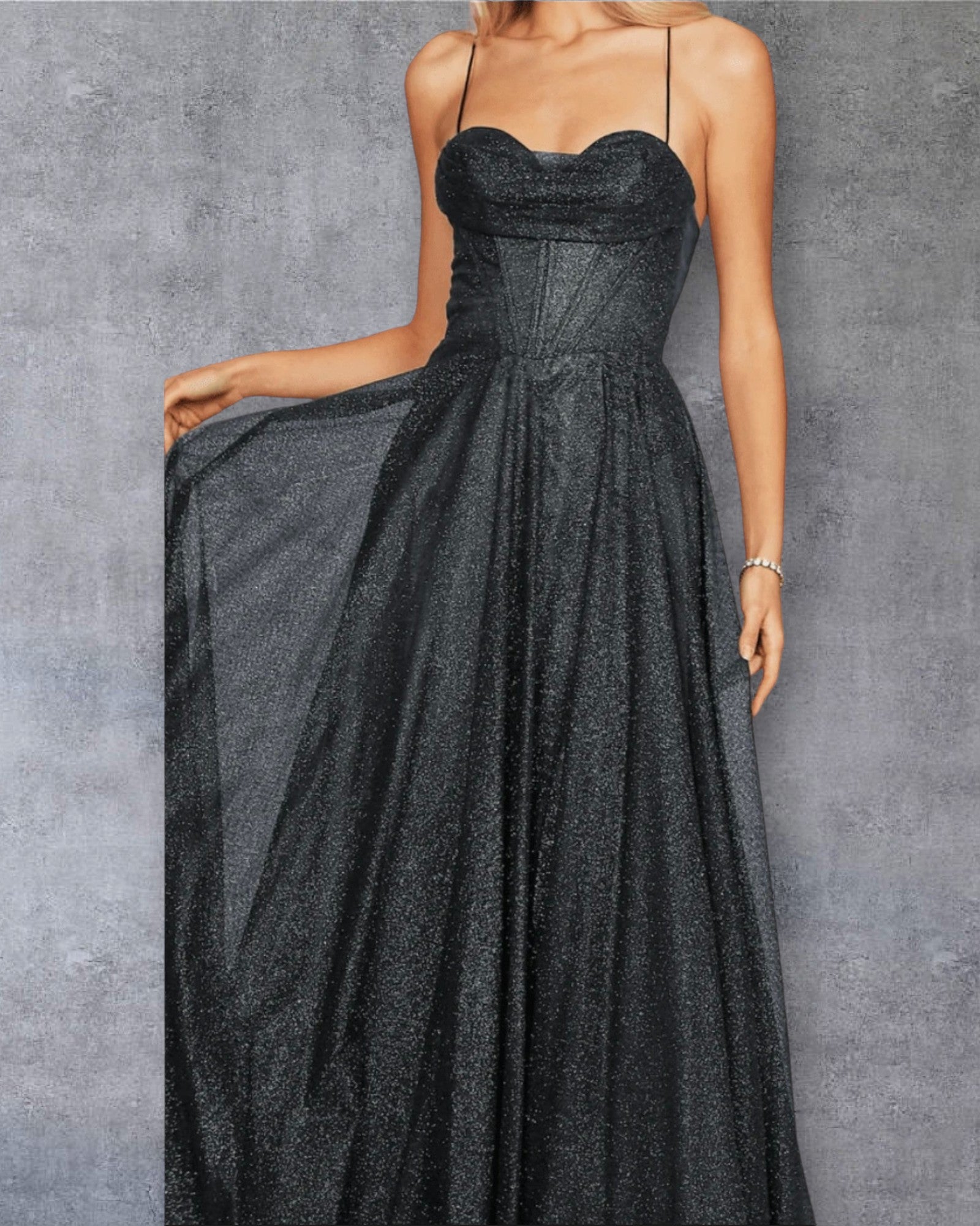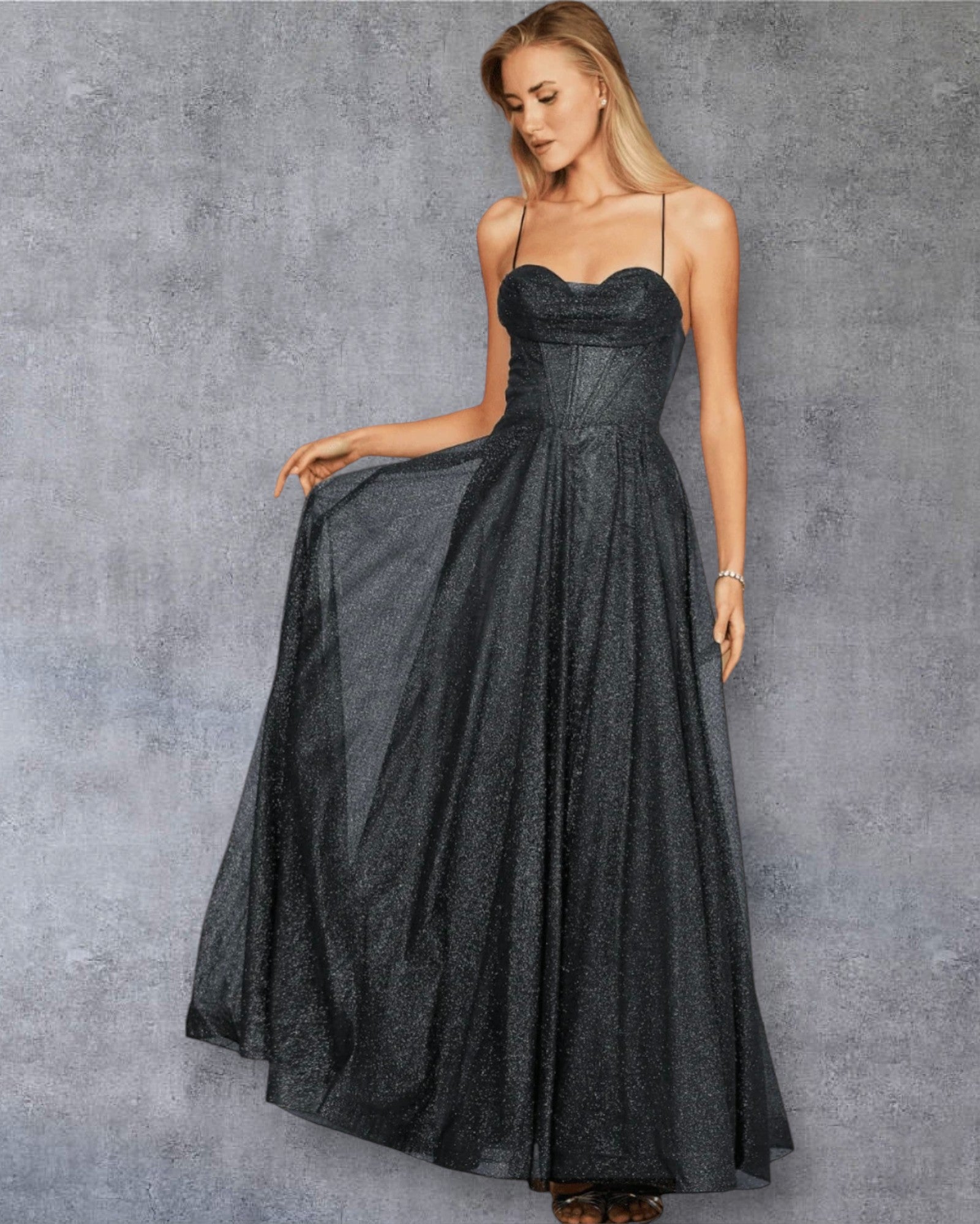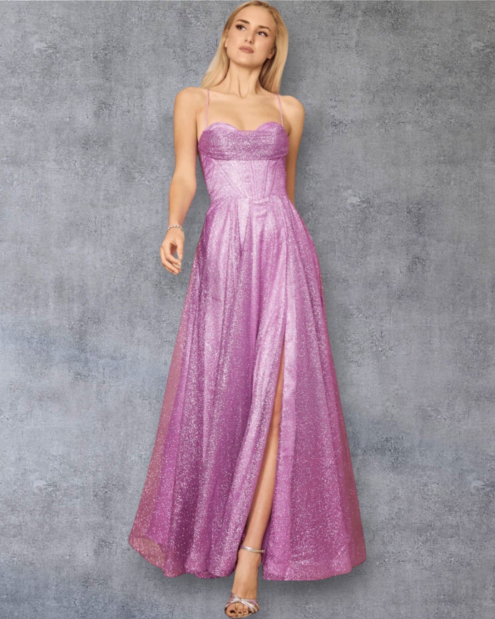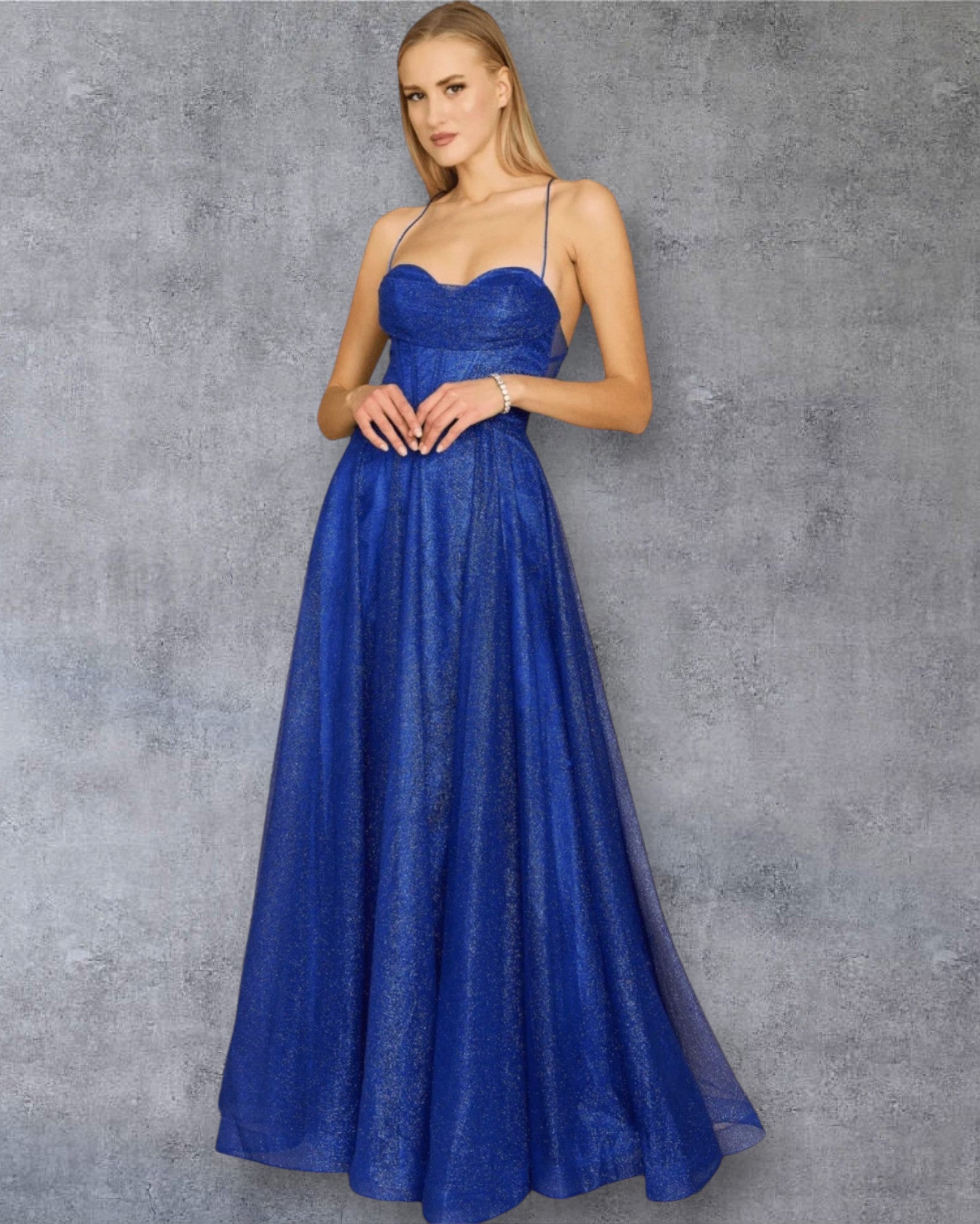 Elegante vestido de fiesta brillante. Su corte A clásico fluye con gracia, mientras que la espalda cruzada añade un detalle moderno y cómodo. La abertura lateral ofrece un toque de sensualidad y movimiento, permitiéndote lucir con confianza y estilo. Este vestido combina un diseño atemporal con un acabado deslumbrante, garantizando que te sientas y luzcas espectaculares en cada paso.