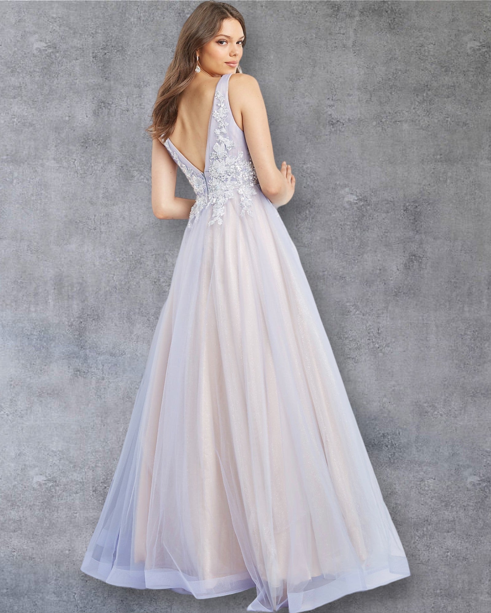 Vestido de fiesta Color Lavanda con Bordado Reluciente y Falda de Tul Brillante