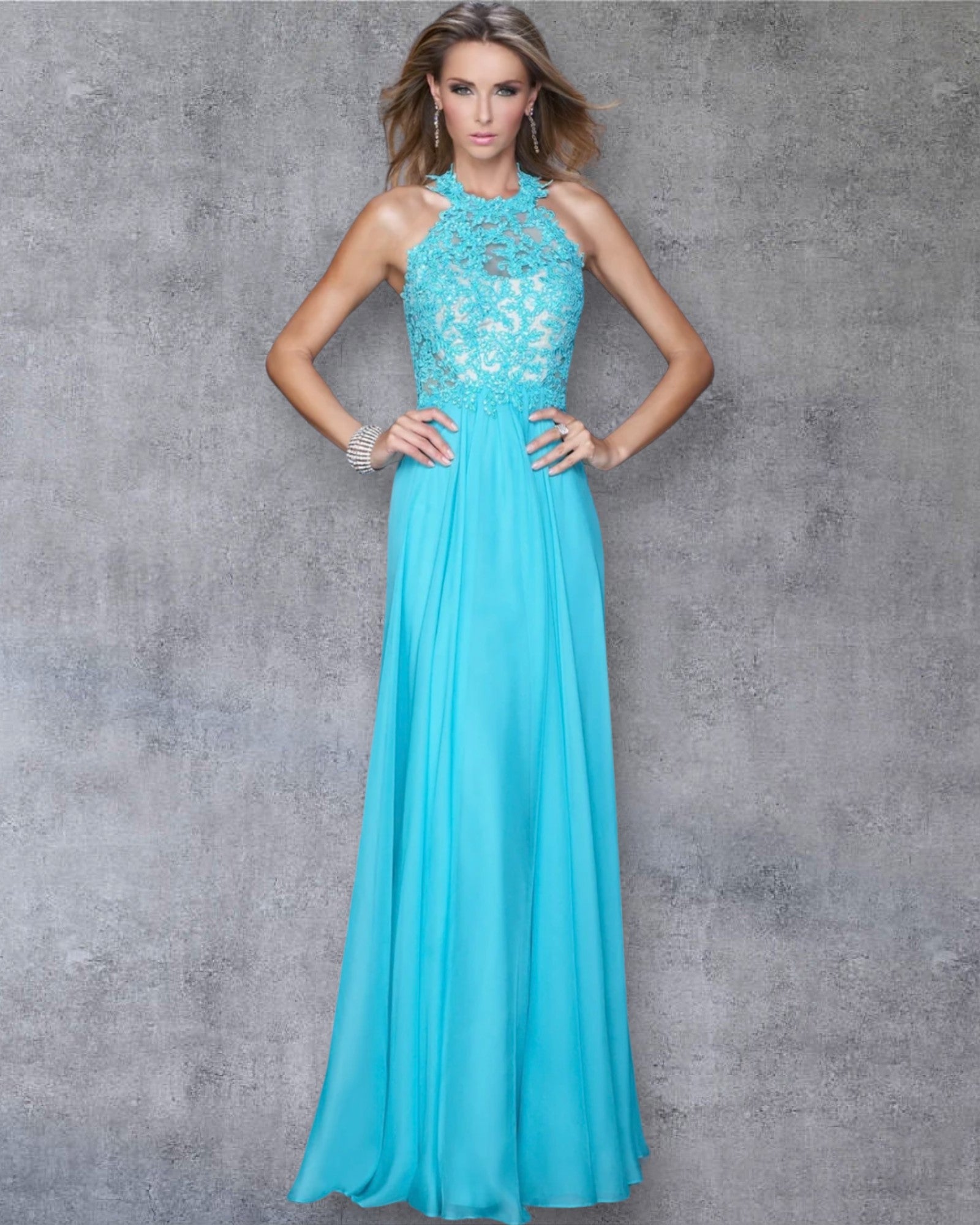 Vestido de Fiesta con Apliques de Encaje y Escote Halter