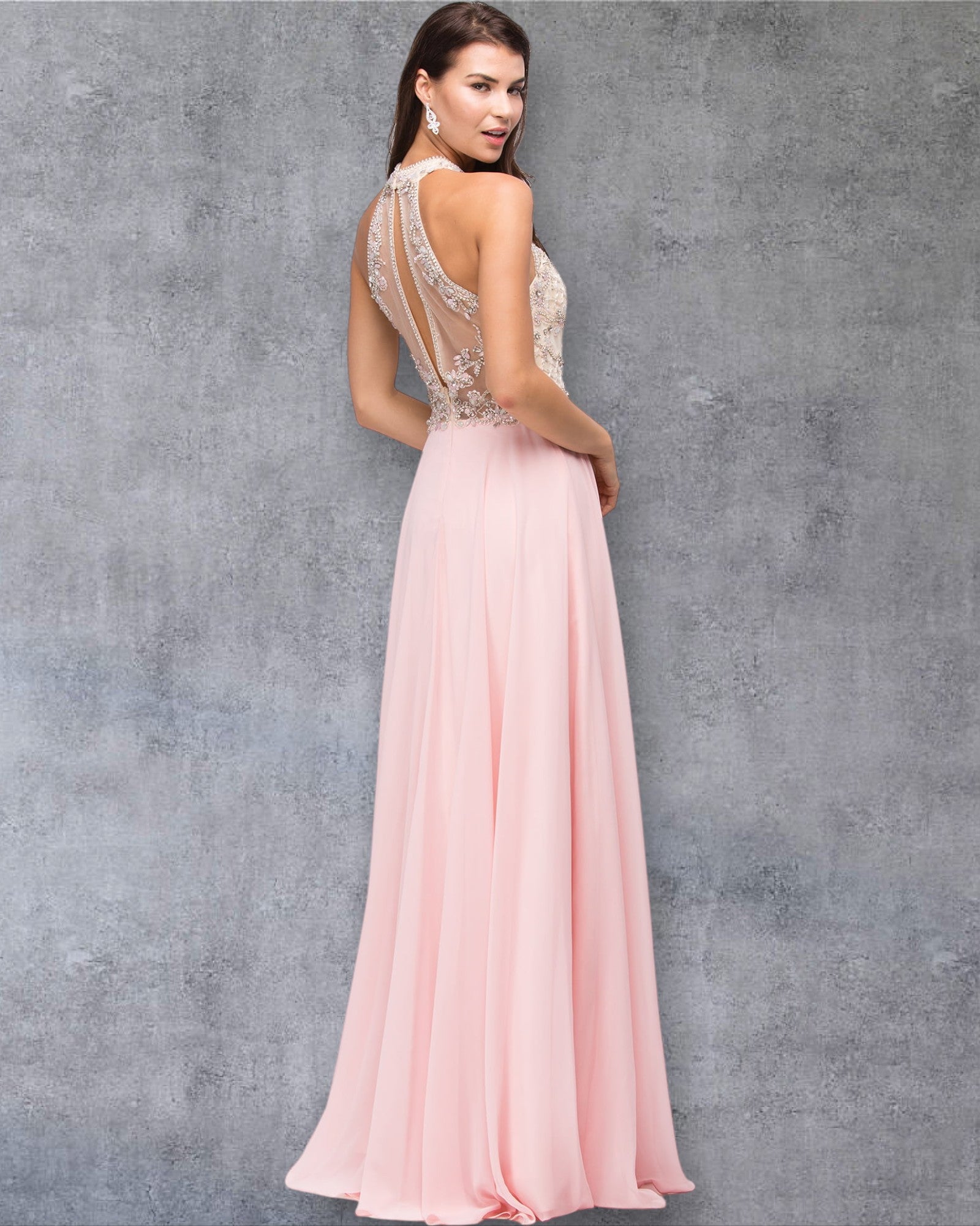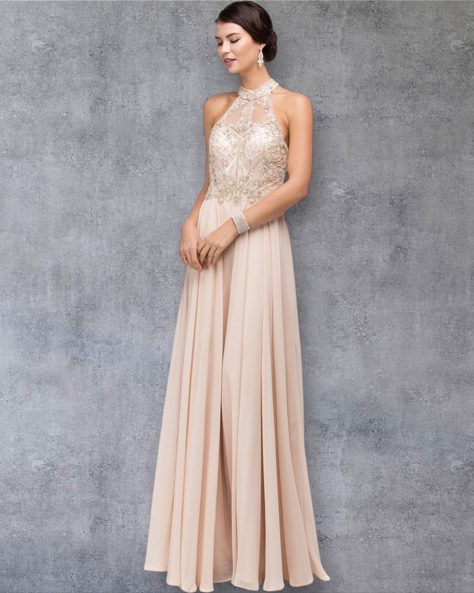 Vestido de fiesta con cuello alto, falda vaporosa y abertura en la espalda, con ilusión bordada