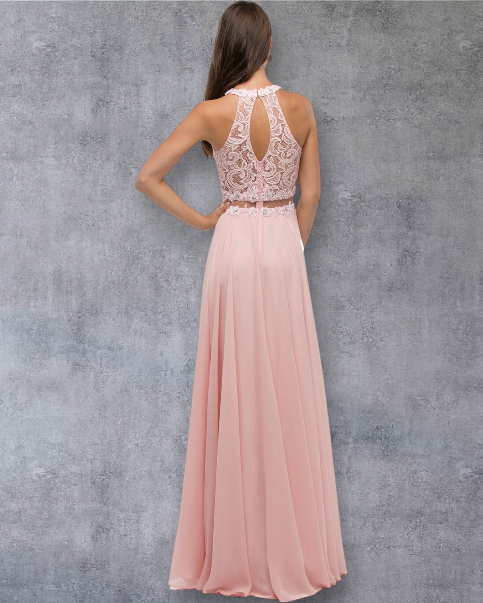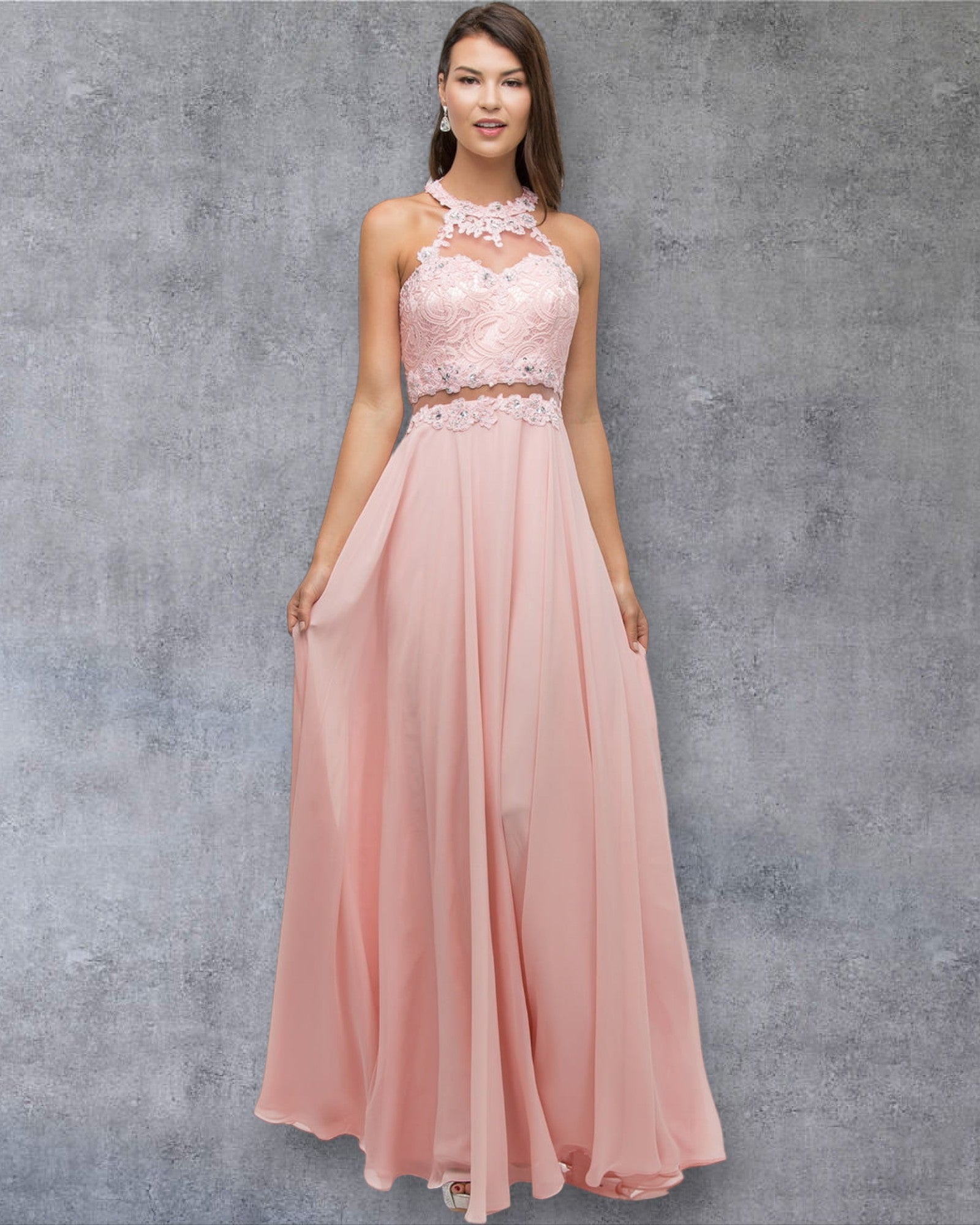 Vestido de fiesta con cuello halter, corpiño con apliques florales y detalle de cintura transparente