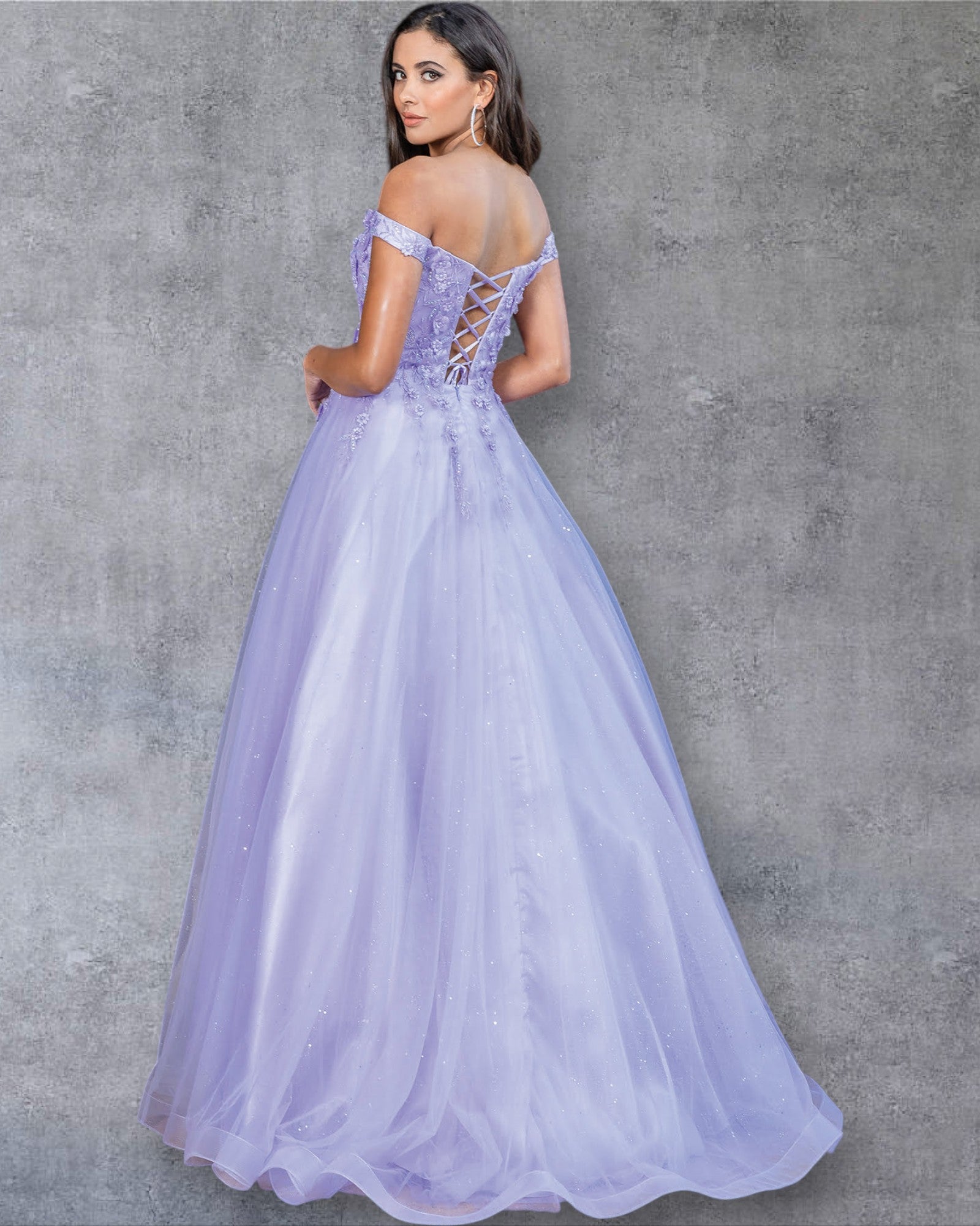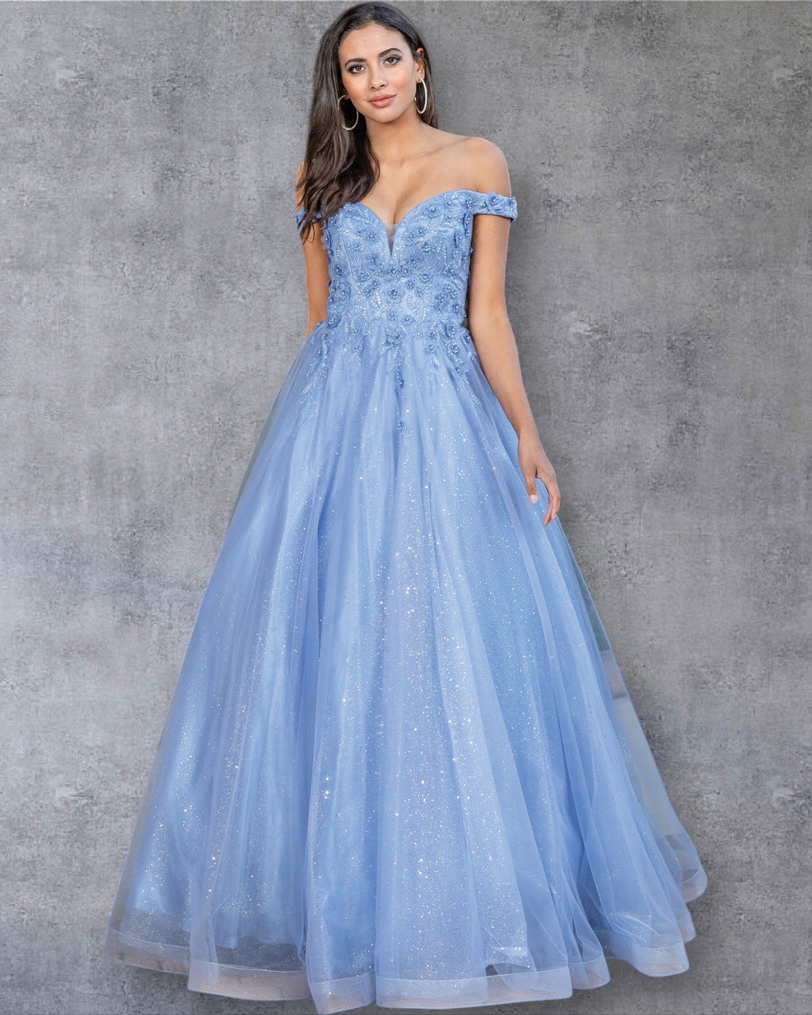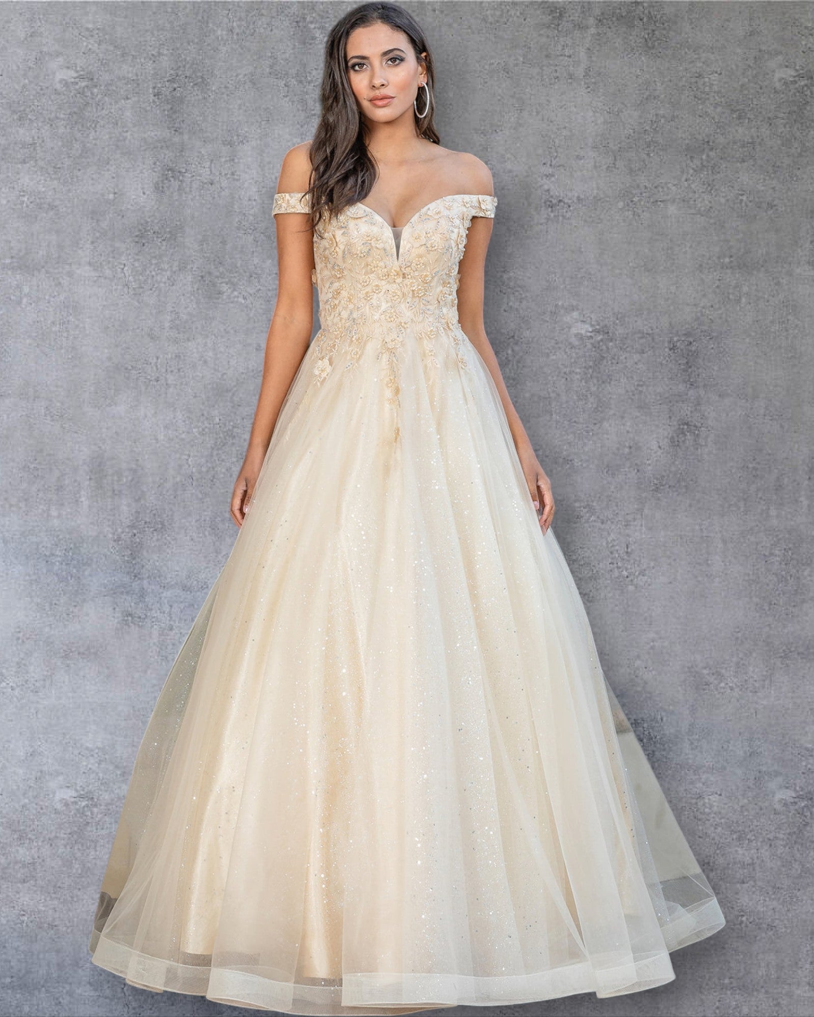 Vestido de fiesta con escote de cuentas, mangas con hombros descubiertos y falda de tul