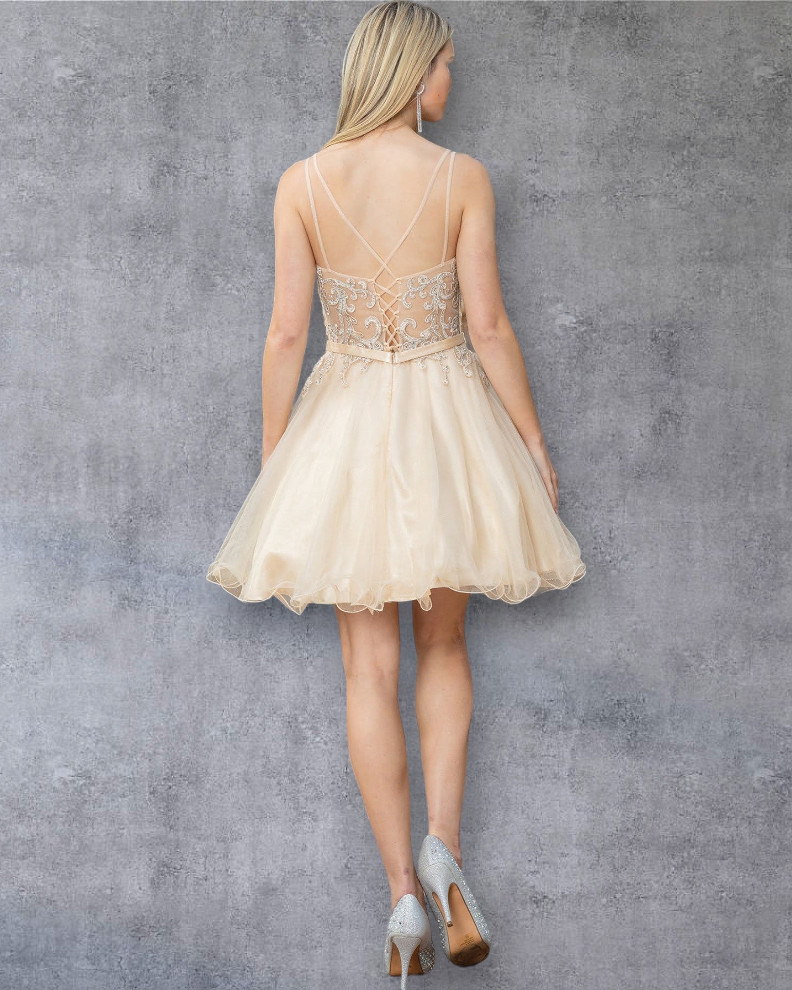 Vestido de fiesta con escote en V, falda de tul con corpiño bordado