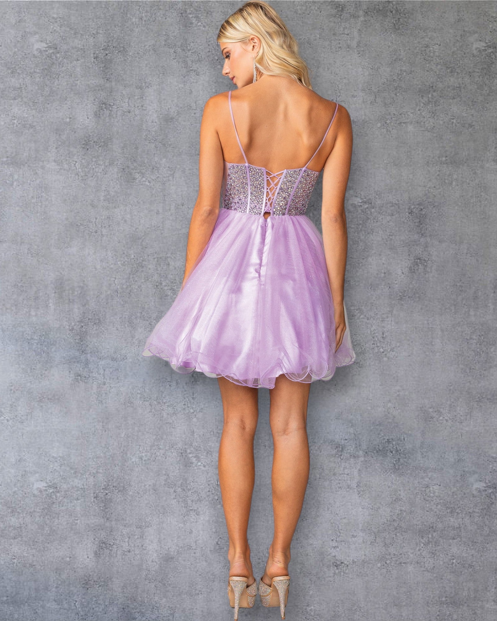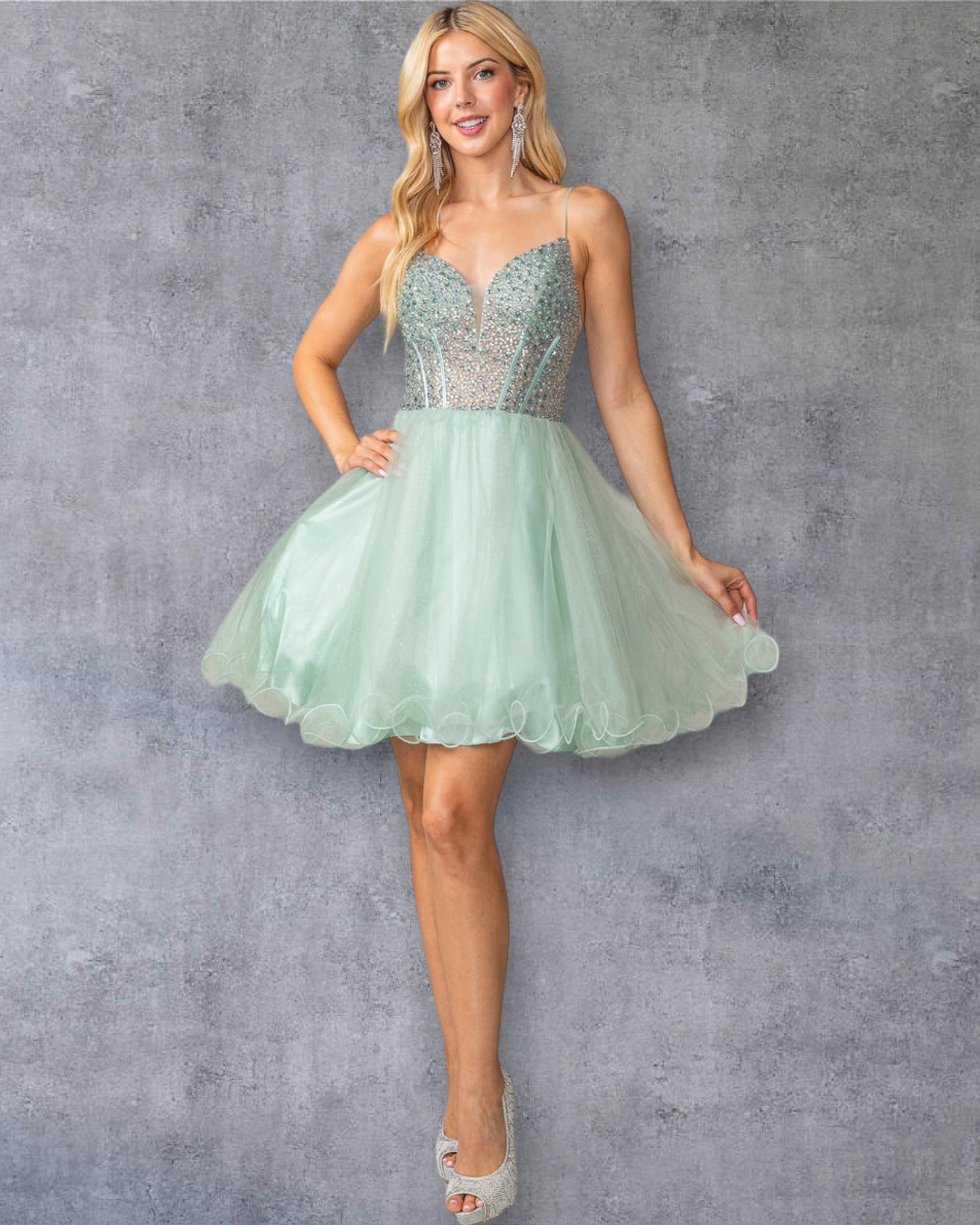 Vestido de fiesta con escote pronunciado, corpiño de lentejuelas brillantes y falda superpuesta de tul
