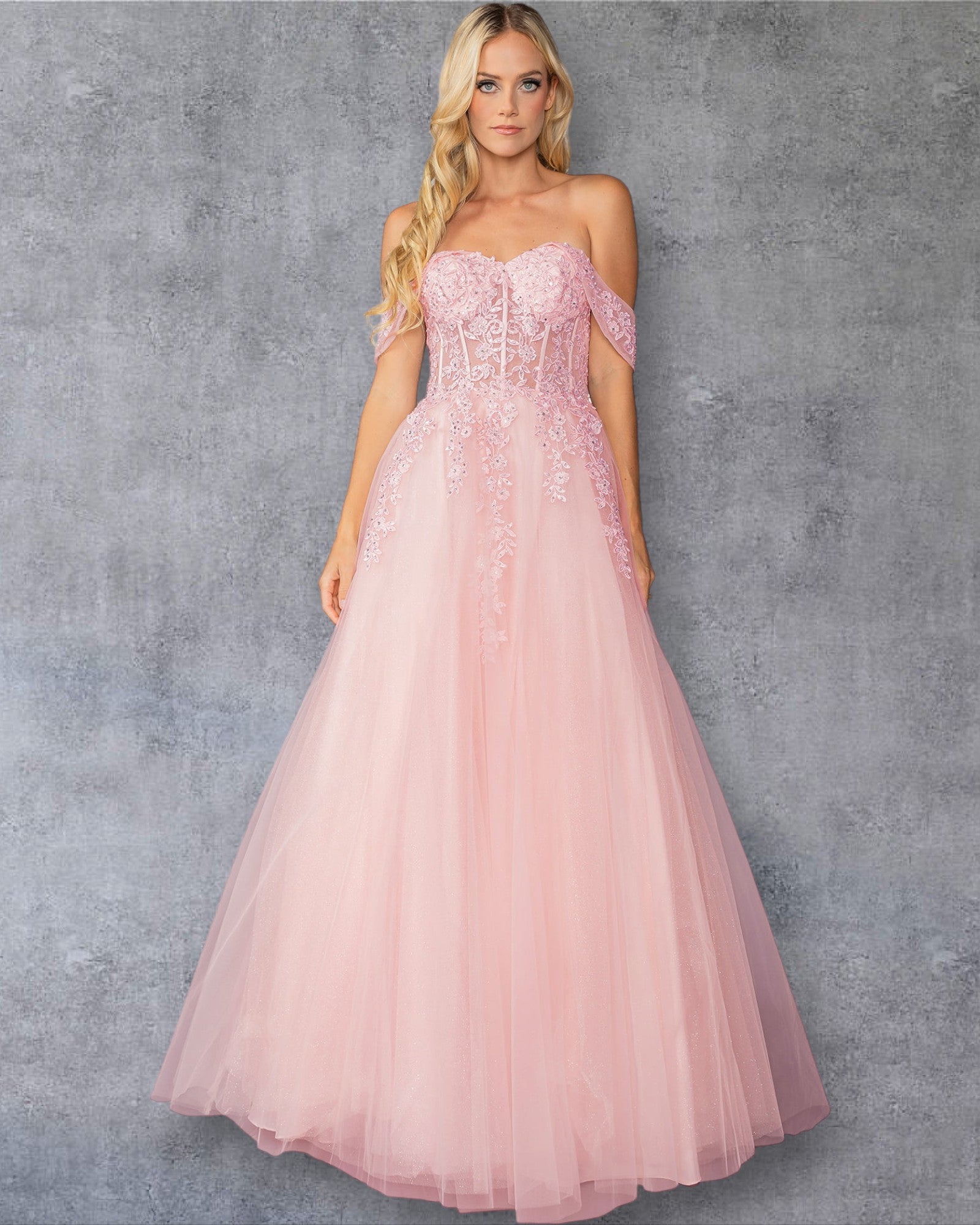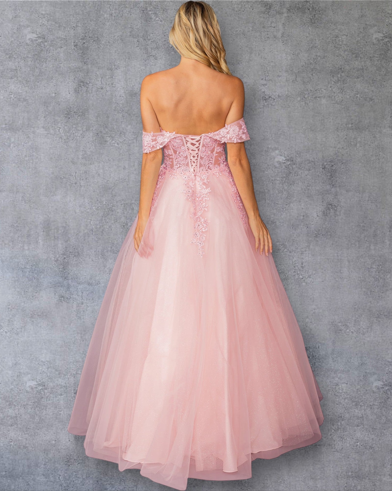 Vestido de fiesta con hombros descubiertos, corpiño de encaje floral intrincado, falda de malla transparente, detalles de cuentas y un espectacular diseño largo con abertura lateral.