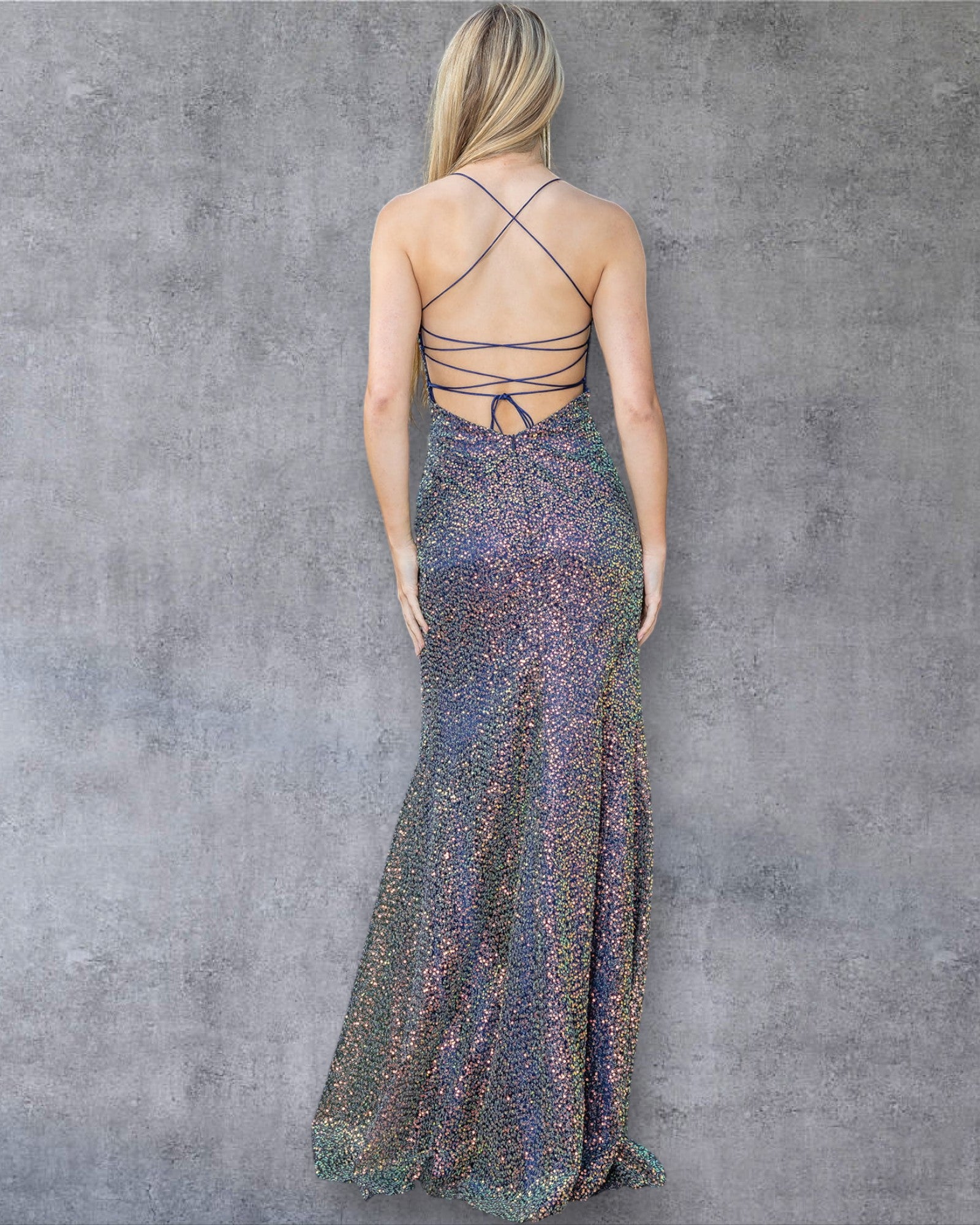 Vestido de fiesta con tirantes finos, purpurina, estilo cruzado en la parte delantera y abertura alta