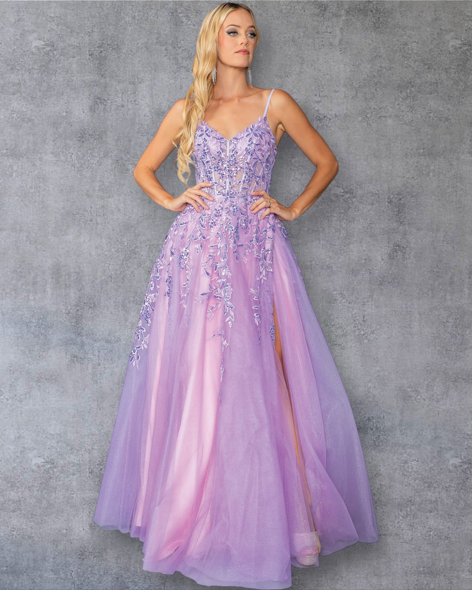 Vestido de fiesta de corte A con escote en V, lentejuelas y transparencias