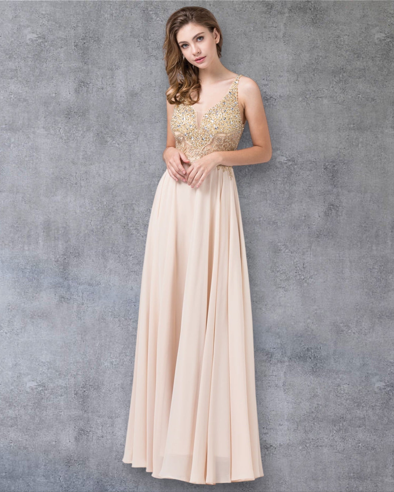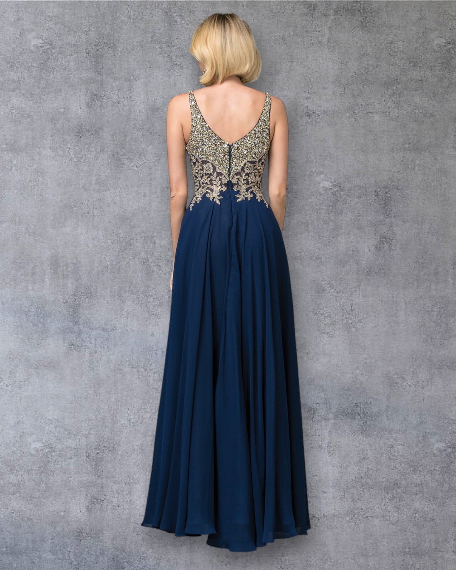Vestido de fiesta de corte A sin mangas con escote en V y lentejuelas bordadas