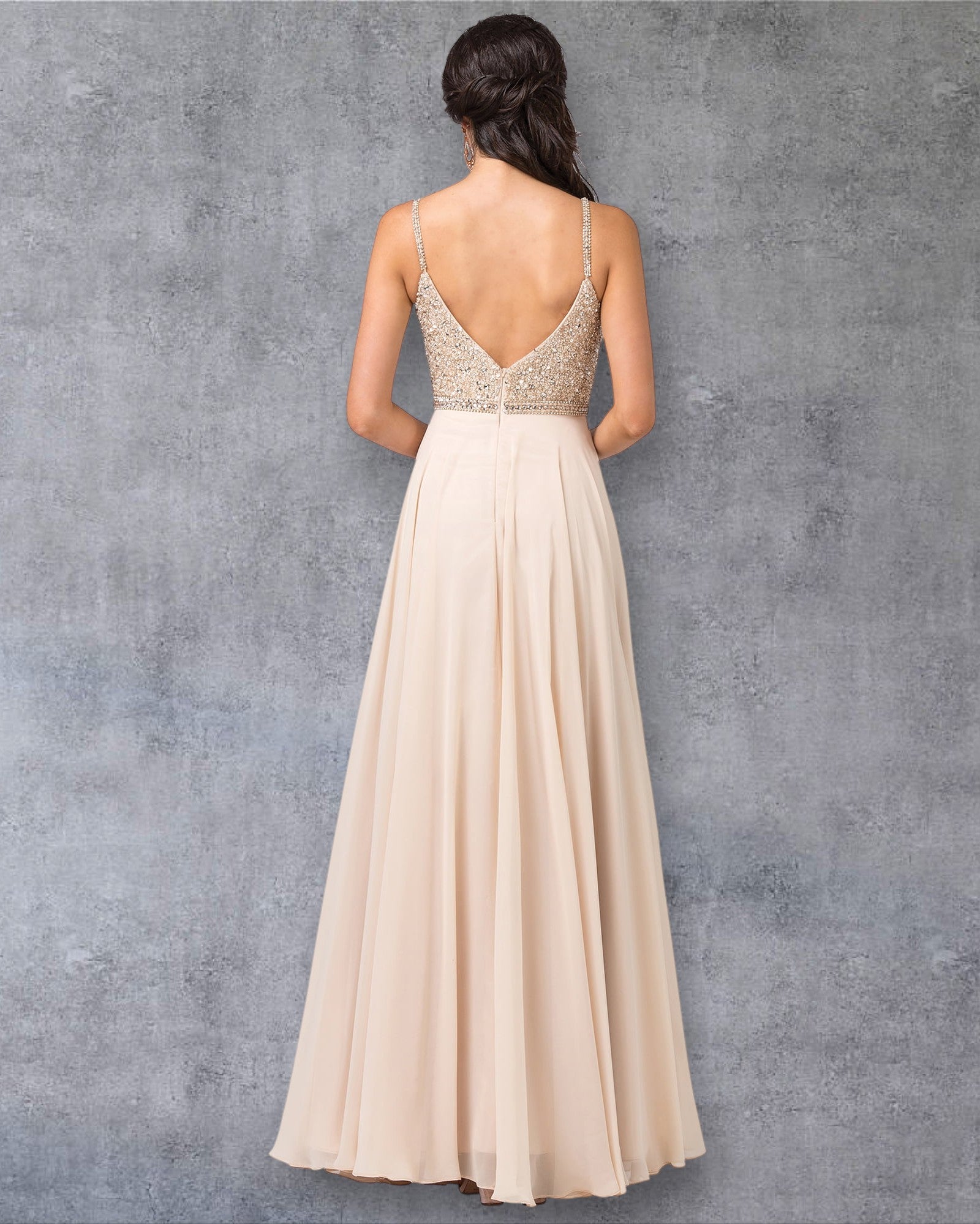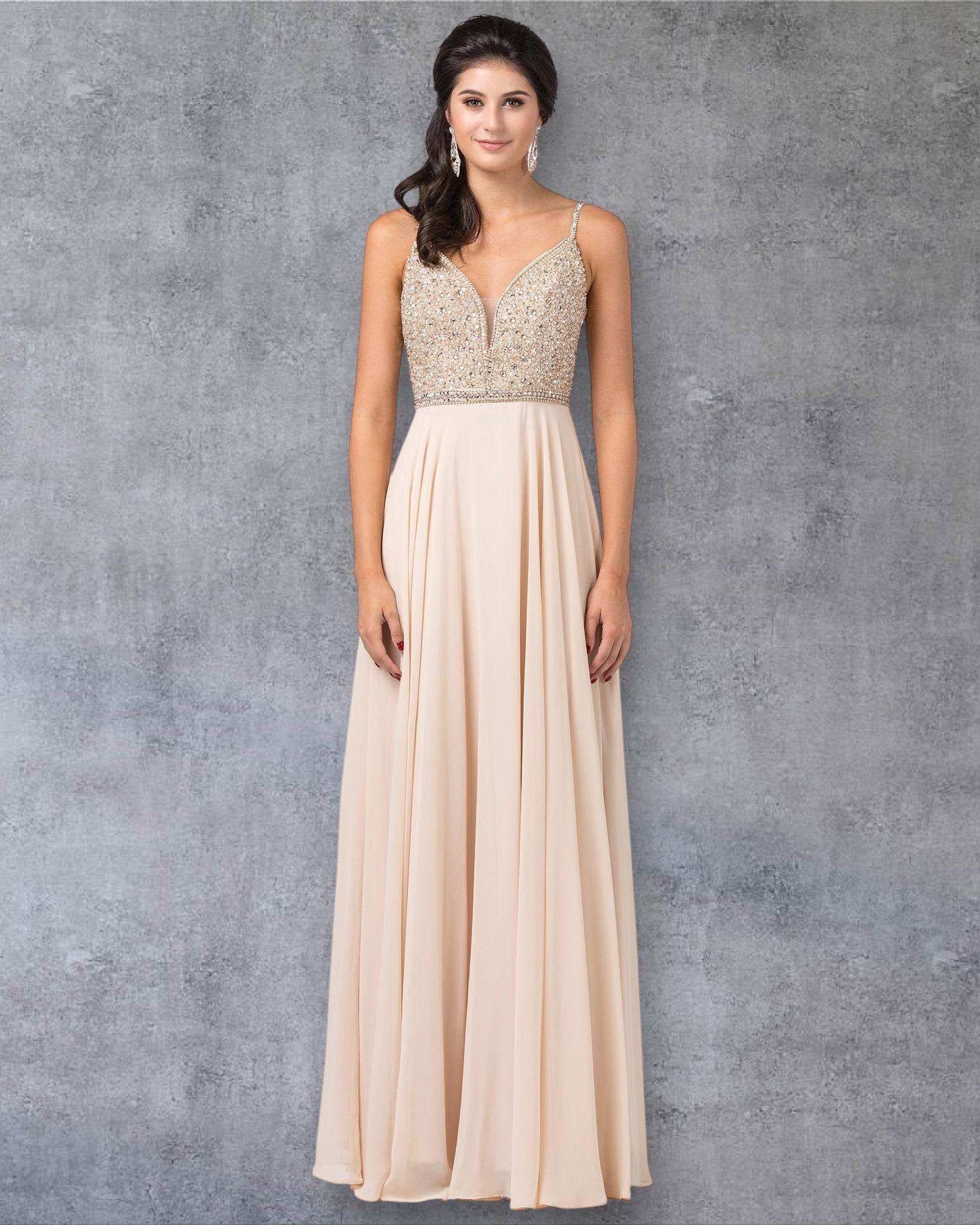 Vestido de fiesta de gasa con escote en A y tirantes finos con corpiño adornado