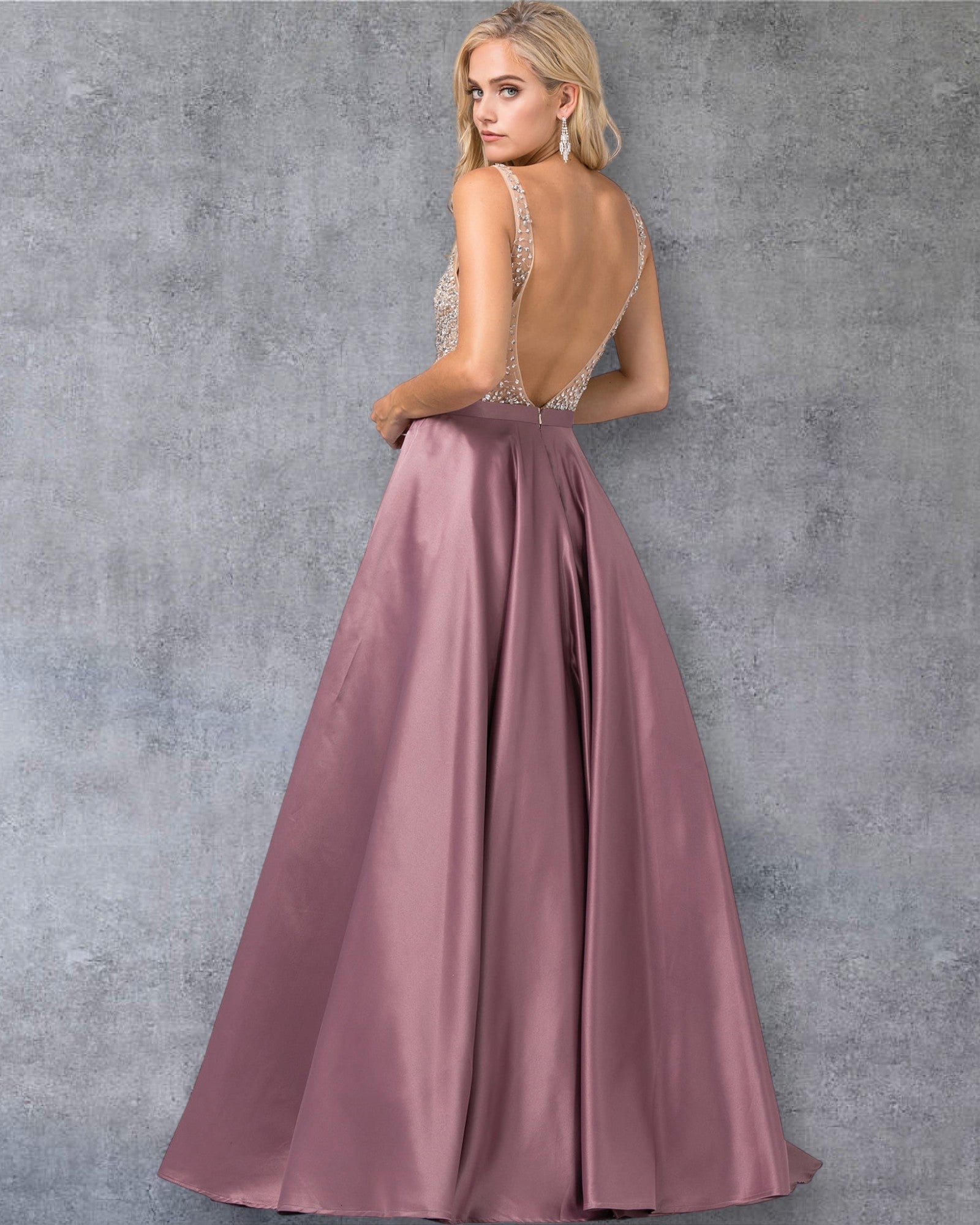 Vestido de fiesta de satén con escote pronunciado, bolsillos laterales y espalda con ilusión adornada con cristales