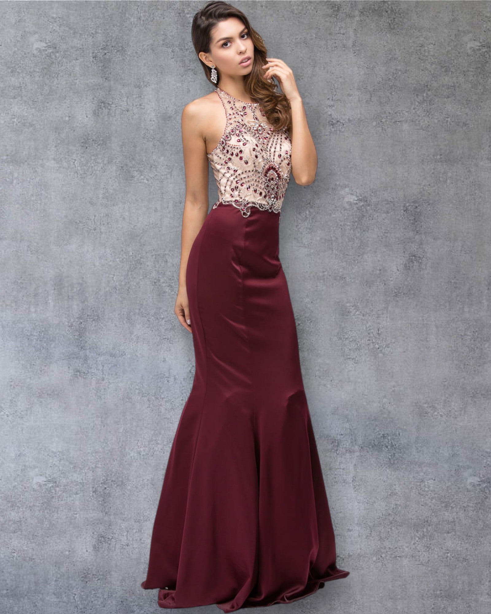 Vestido de fiesta de sirena sin mangas con escote alto y detalle de encaje con cuentas