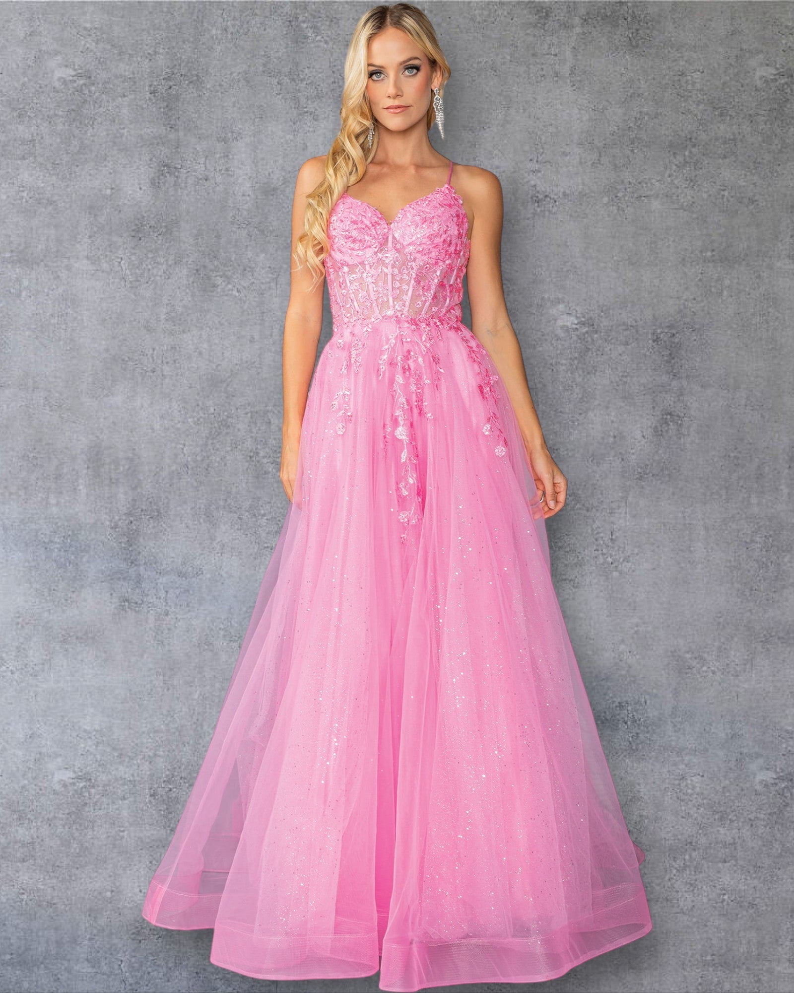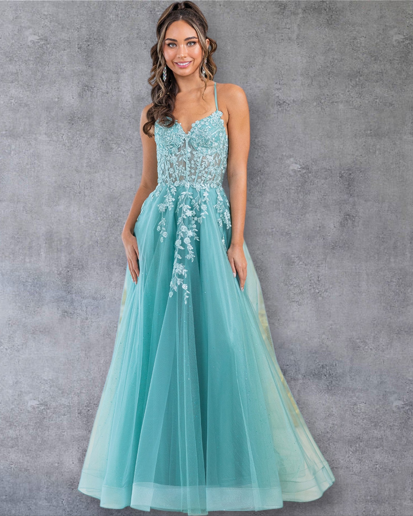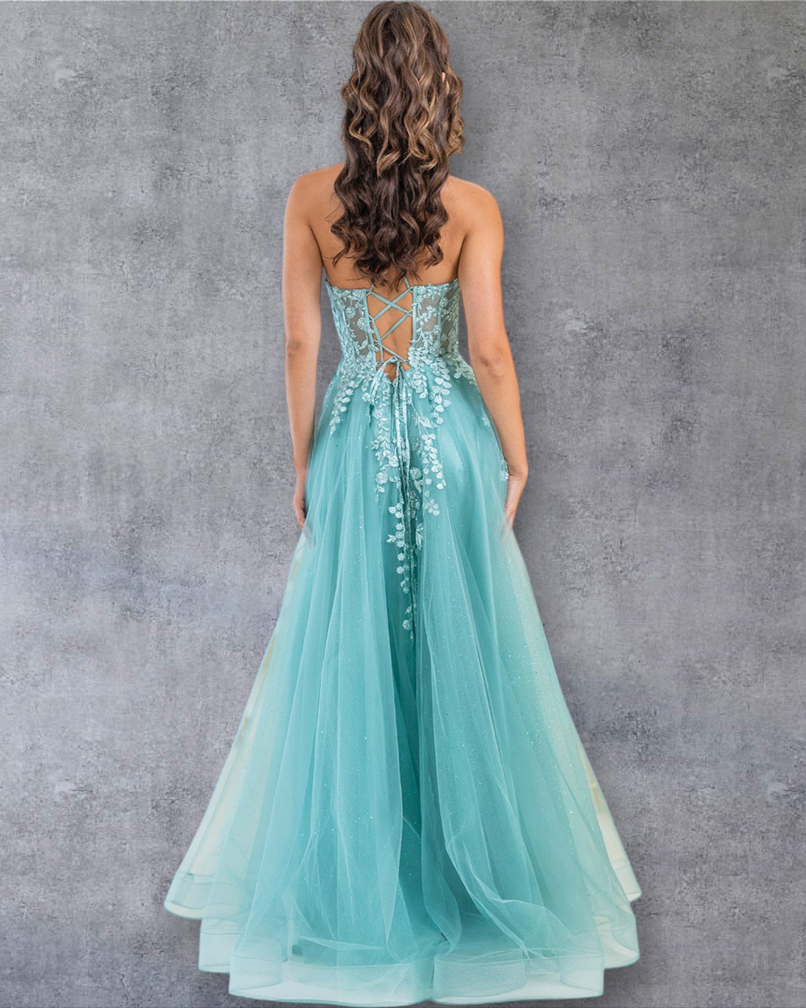 Vestido de fiesta de tul brillante con apliques de encaje y capa de purpurina