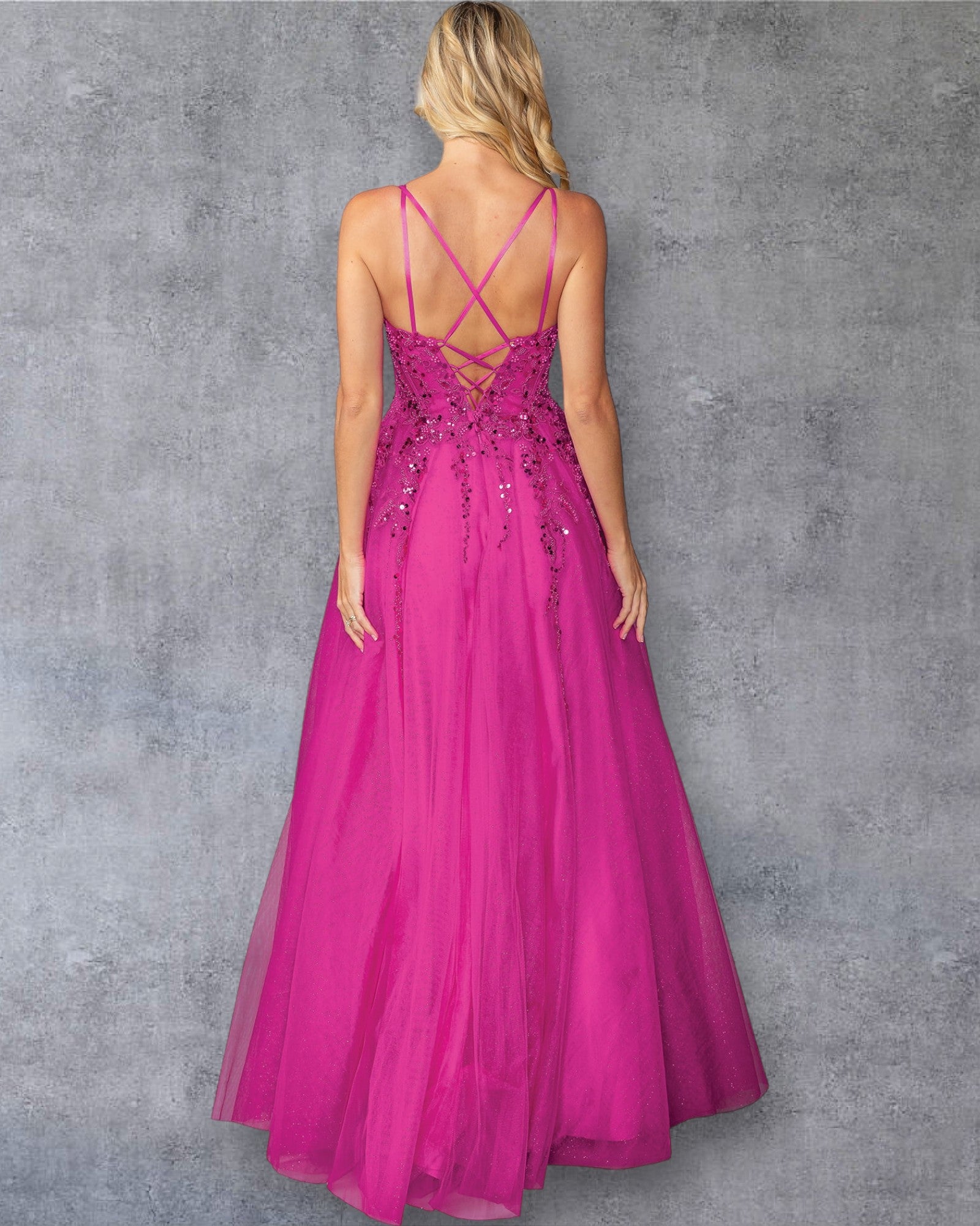 Vestido de fiesta de tul con escote transparente y sin mangas con corpiño de cuentas