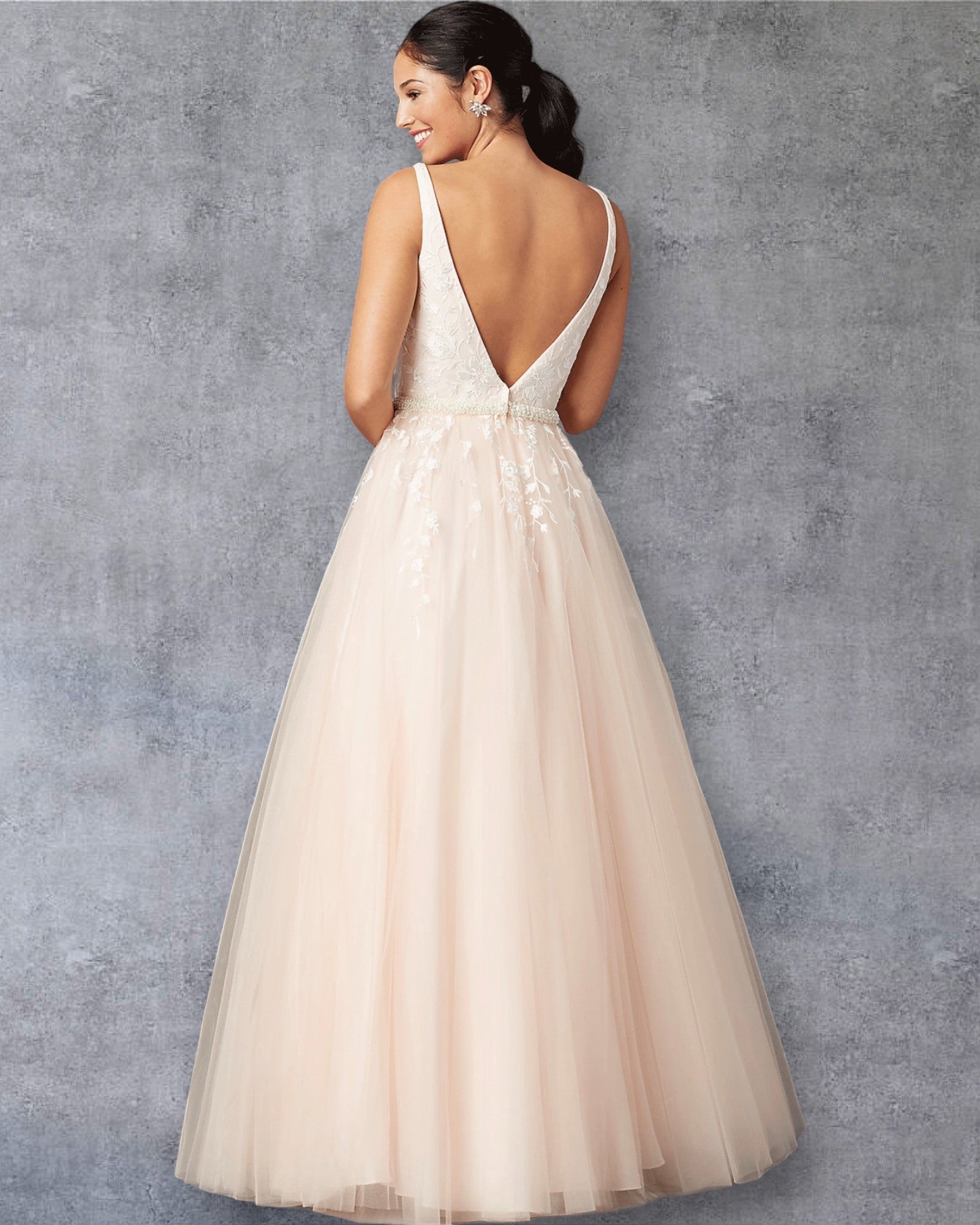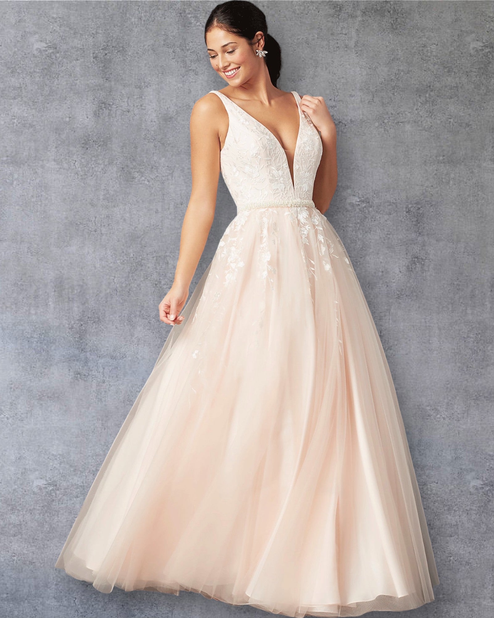Este vestido de fiesta es una verdadera obra de arte para las ocasiones más especiales. Con un delicado escote en V tanto en la parte delantera como en la espalda, su diseño realza la feminidad de manera sutil y elegante. La falda fluida de tul en tono suave añade un toque etéreo, mientras que los bordados florales en el corpiño aportan detalles románticos que destacan con cada movimiento. Perfecto para una quinceañera, este vestido combina la sencillez moderna con un toque clásico, asegurando una apariencia inolvidable.