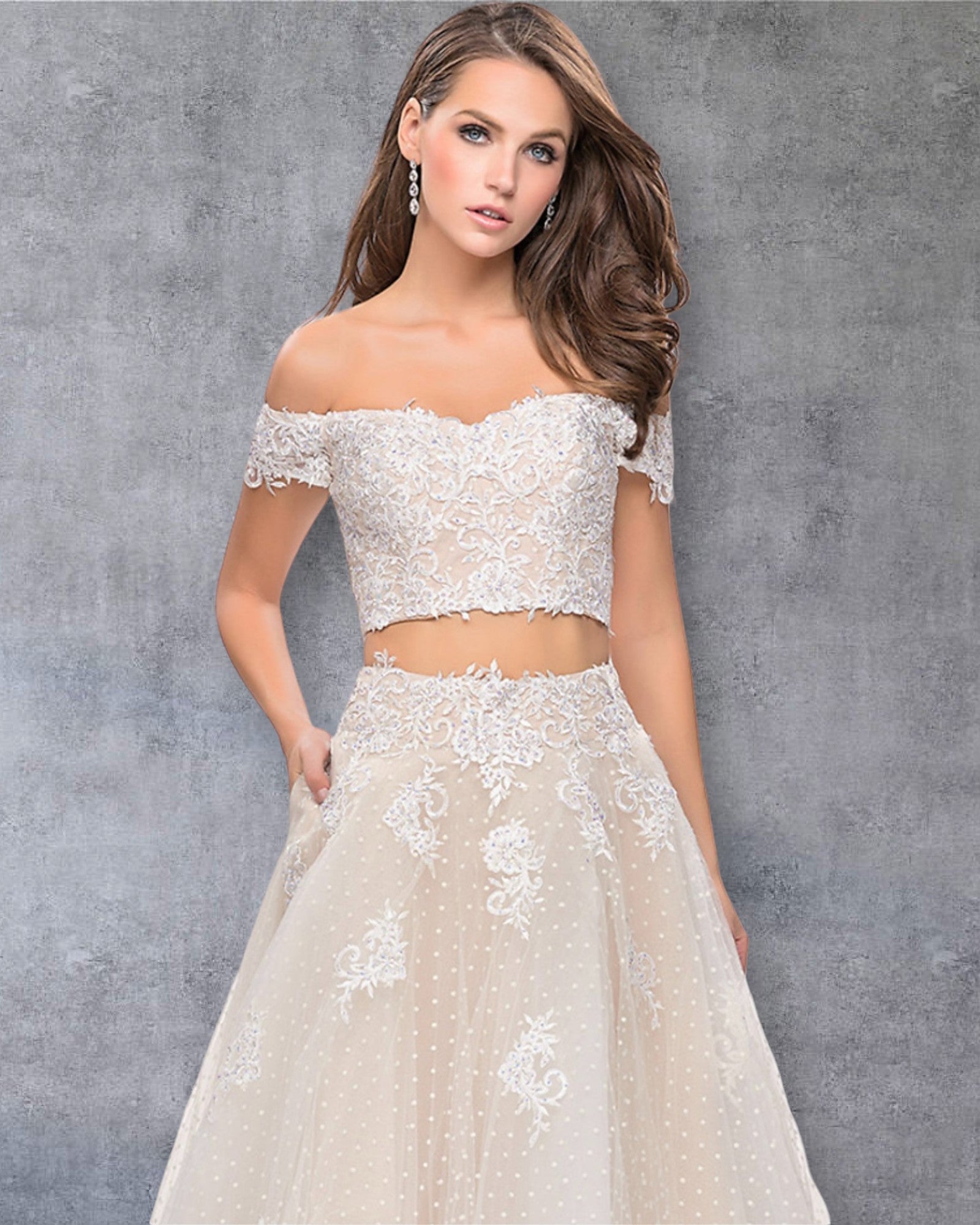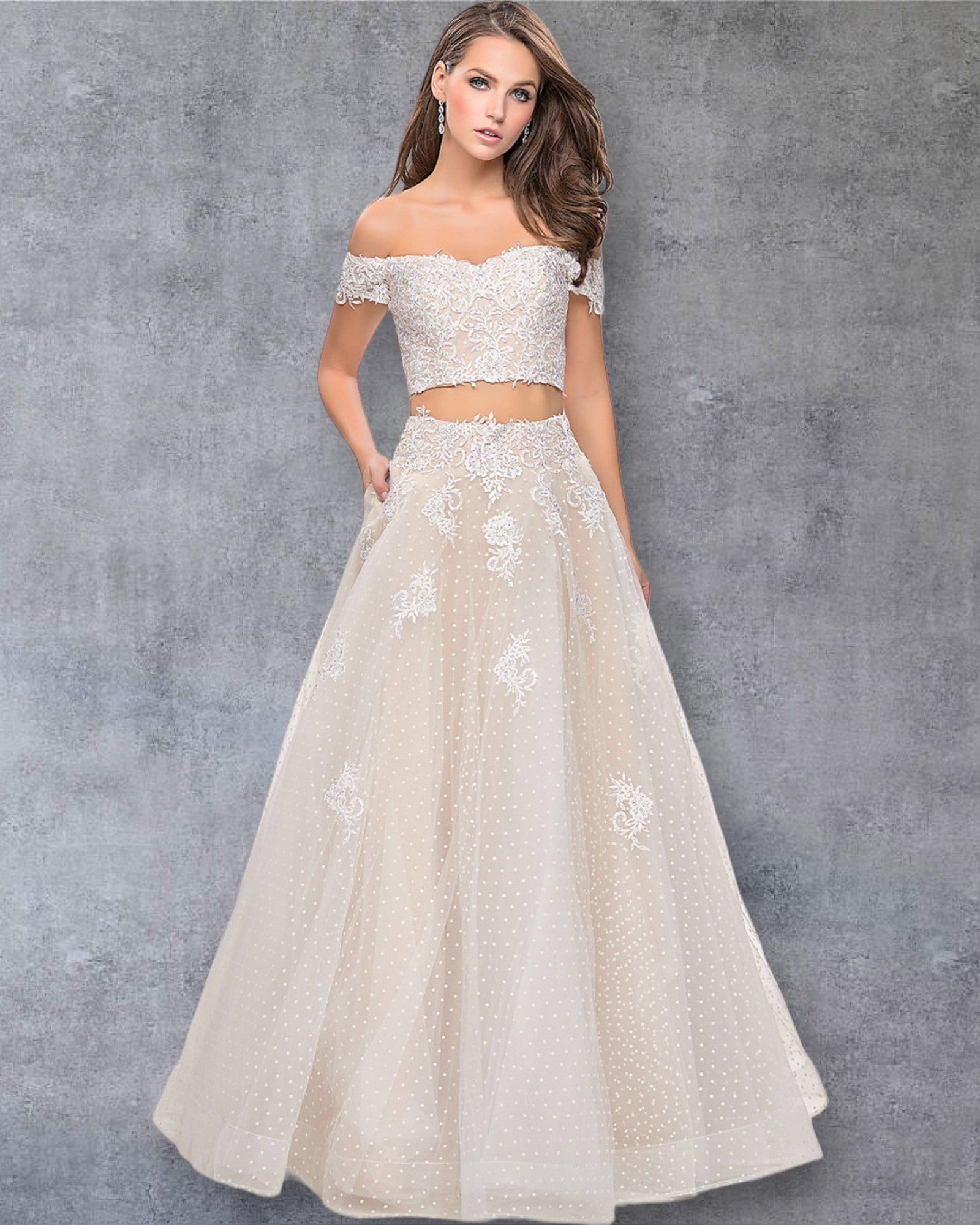 Espectacular vestido de fiesta dos piezas, diseñado para novias y quinceañeras que buscan un toque de originalidad. El top de encaje con delicados apliques crea un look romántico y elegante, mientras que los hombros descubiertos añaden un aire seductor y moderno. La capa de tul con estampado de lunares en contraste otorga movimiento y dinamismo, convirtiéndolo en una pieza única y sofisticada. Con cierre de cremallera en la espalda para un ajuste perfecto, este vestido es la elección ideal para quienes desean un look inolvidable y lleno de detalles.