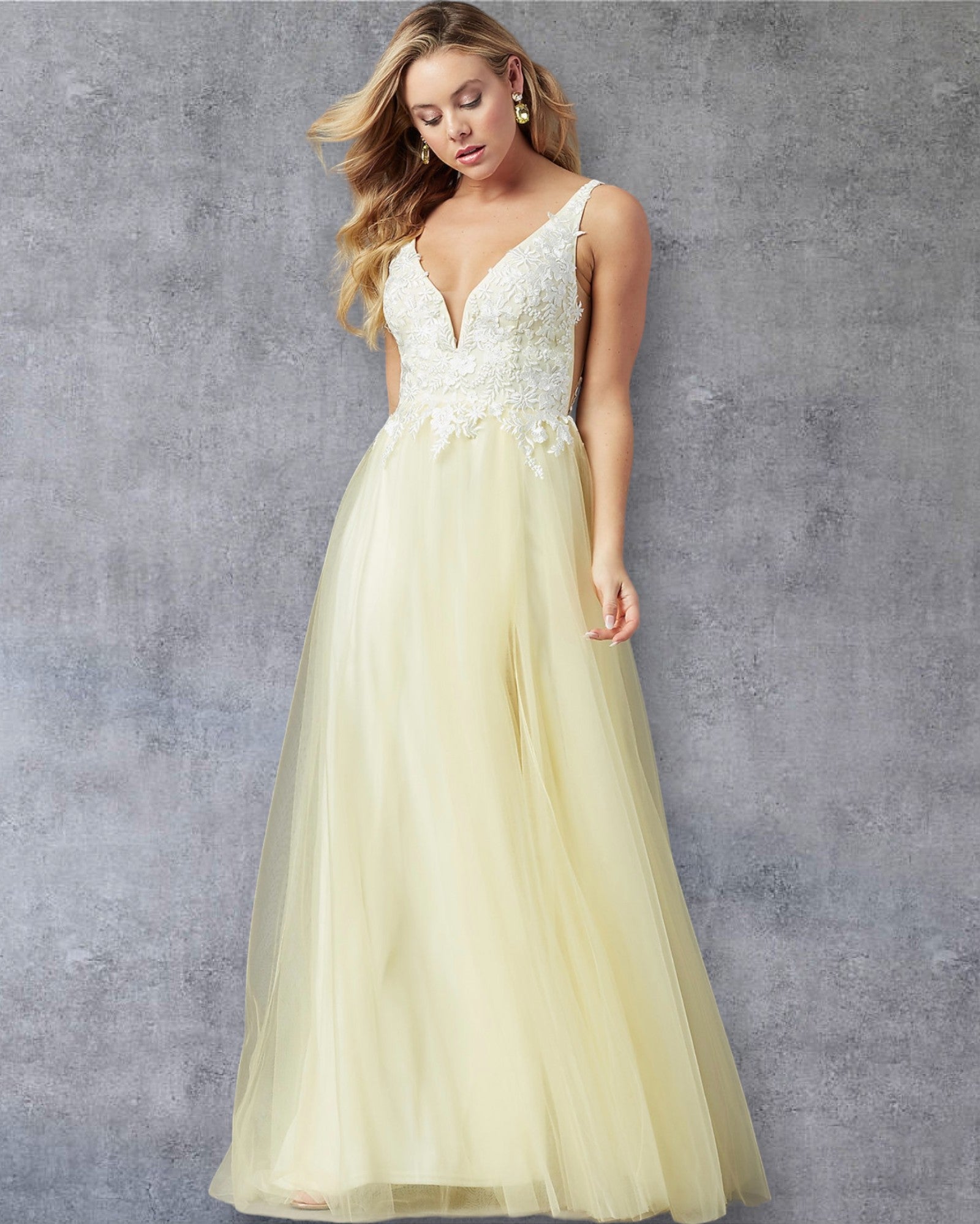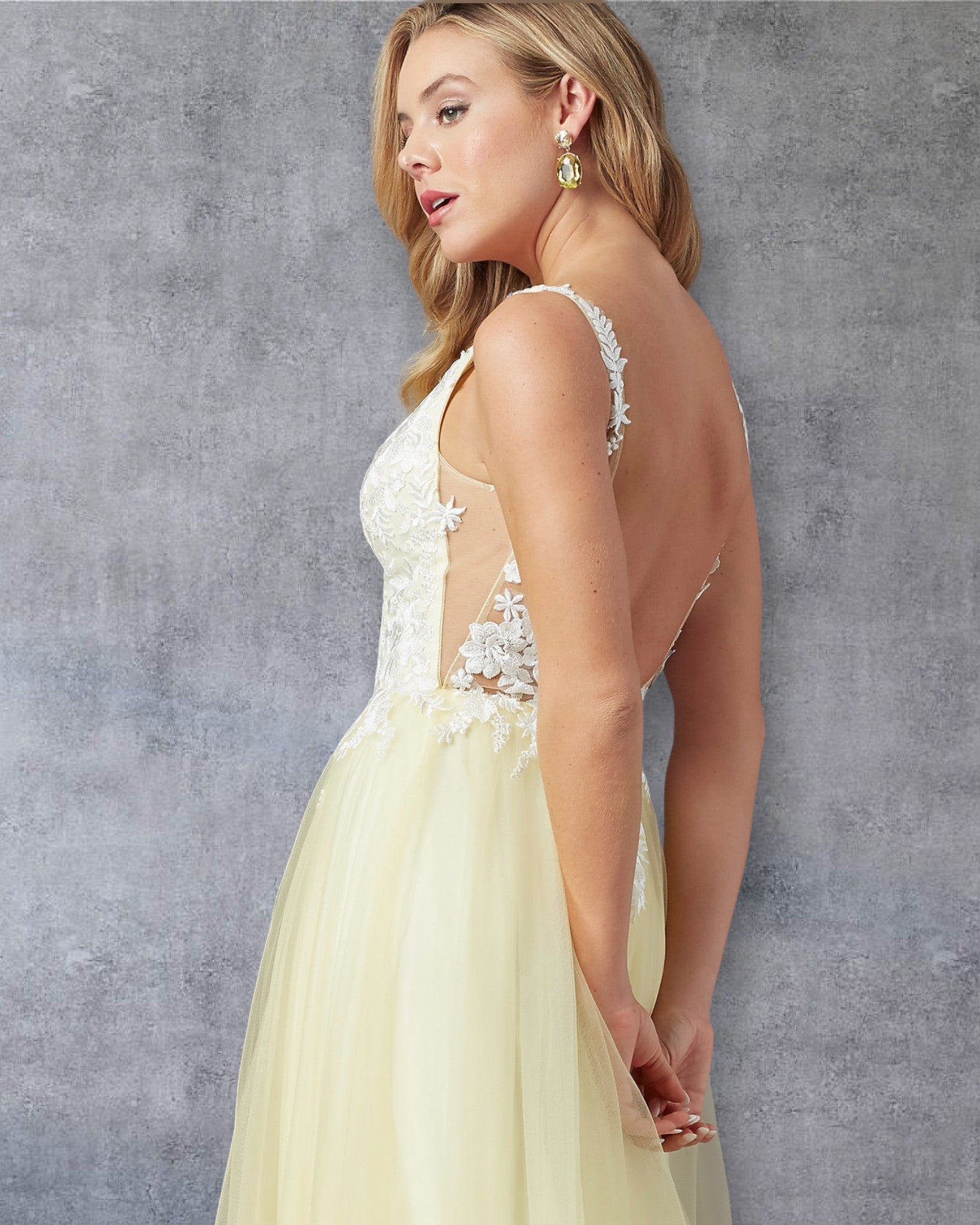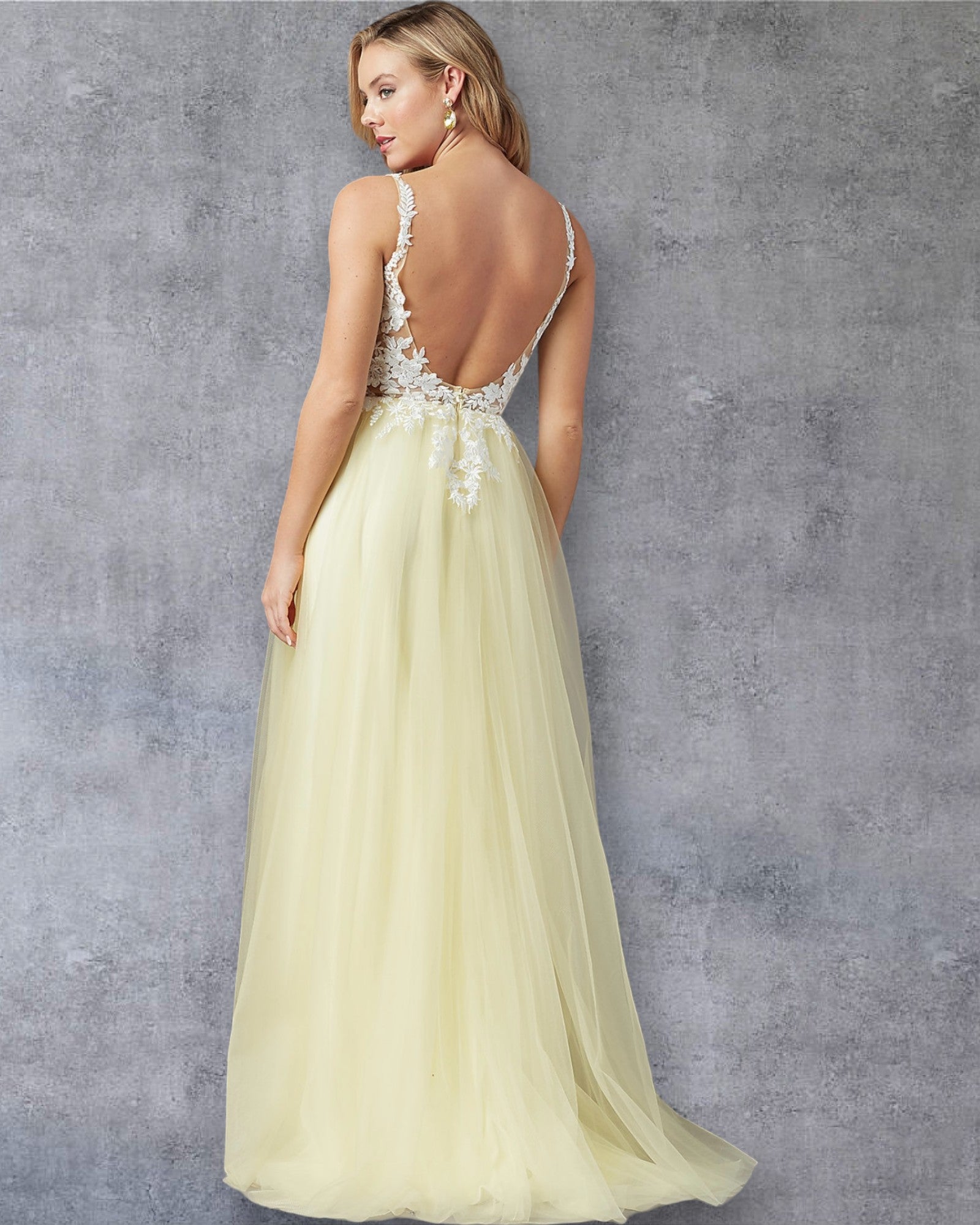 Vestido de Fiesta en Tul Amarillo Pastel con Encaje y Espalda Descubierta