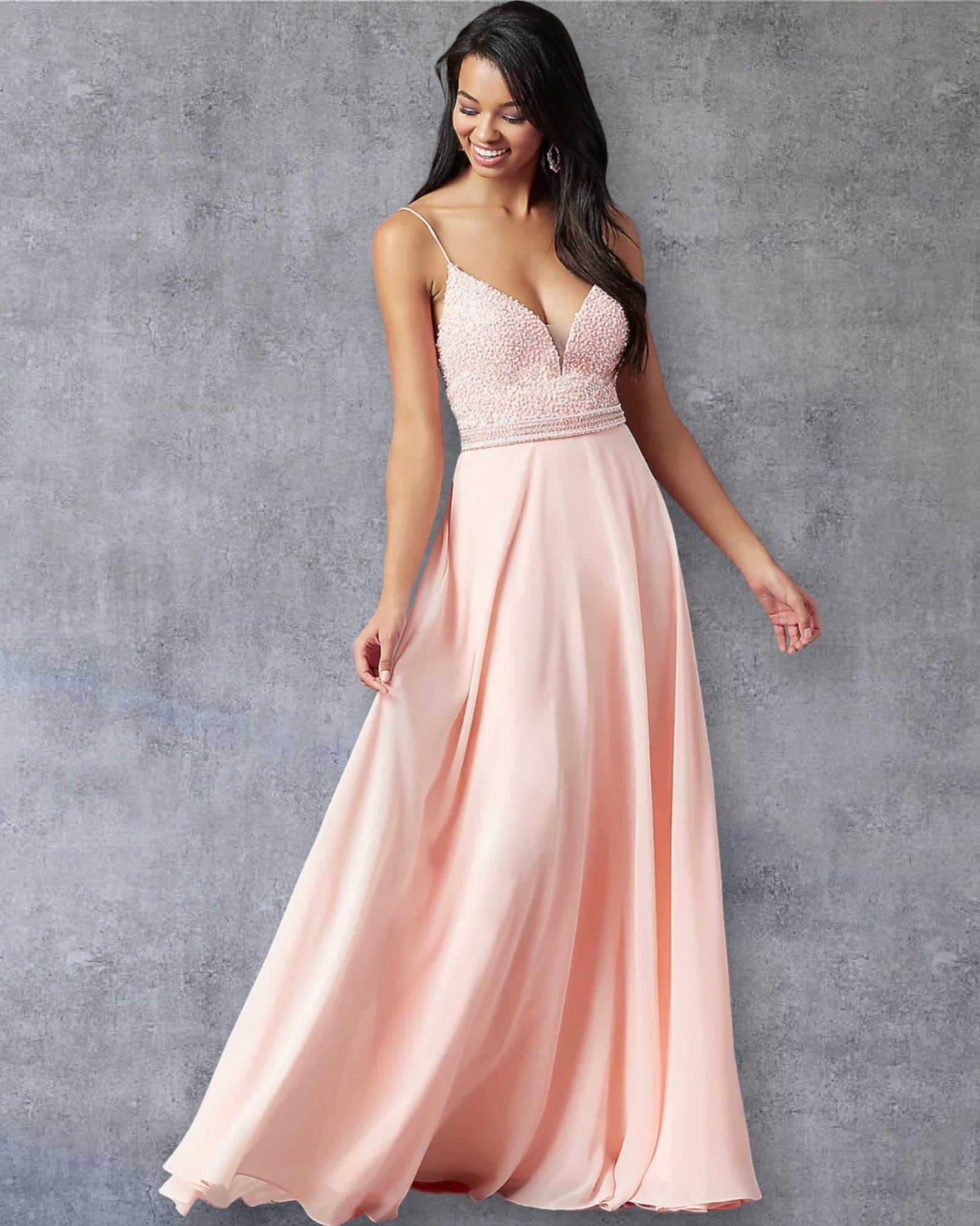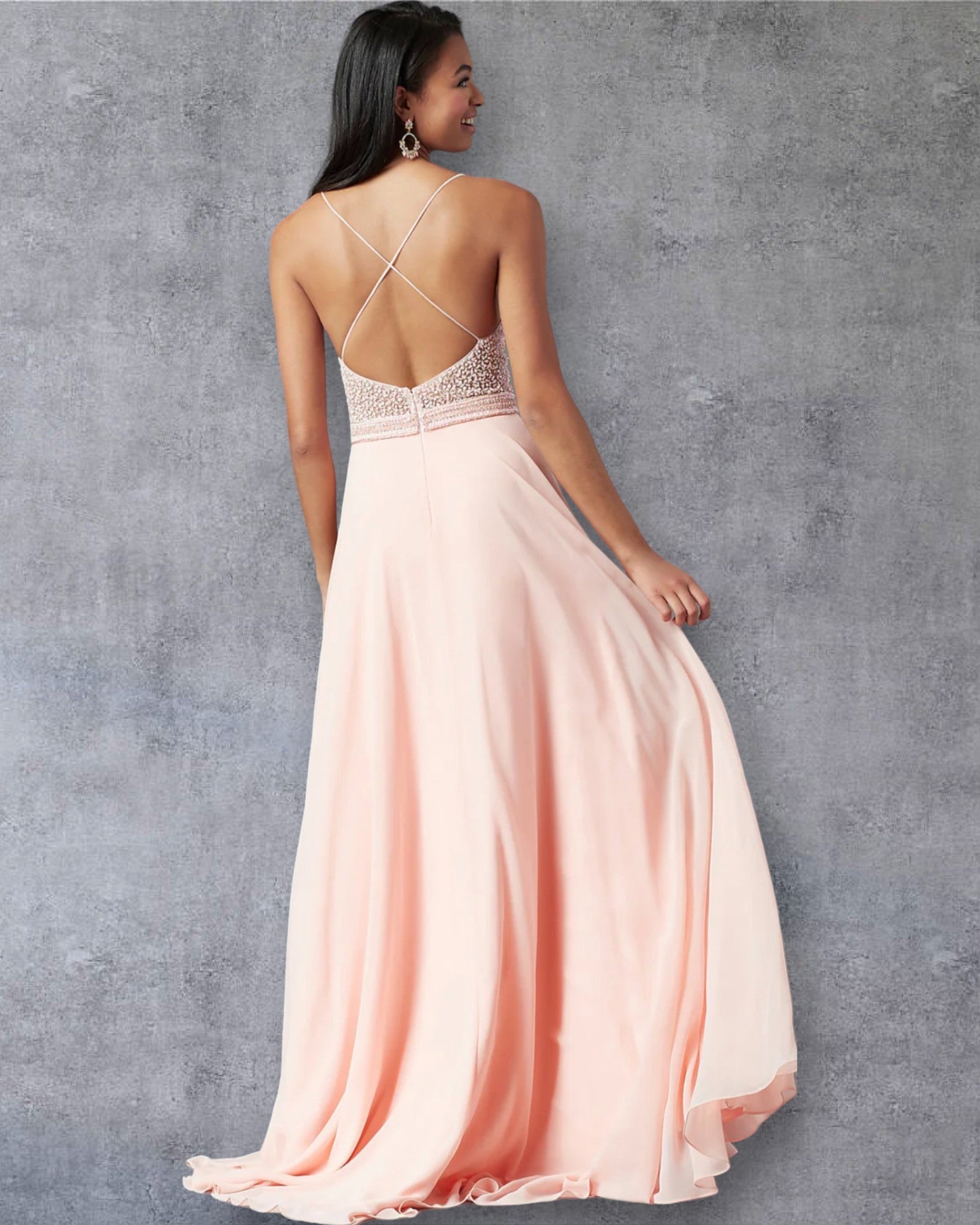 Este encantador vestido de fiesta en color rosa pastel es la elección perfecta para un look romántico y cómodo. El corpiño con escote en V está adornado con delicada pedrería que aporta un brillo sutil y elegante. La cintura entallada acentúa la figura, mientras que la falda de gasa fluida crea un movimiento suave y ligero al caminar. La espalda descubierta con tirantes finos cruzados añade un toque moderno y sensual. Ideal para invitadas a bodas o cualquier evento formal, este vestido combina a la perfección estilo.