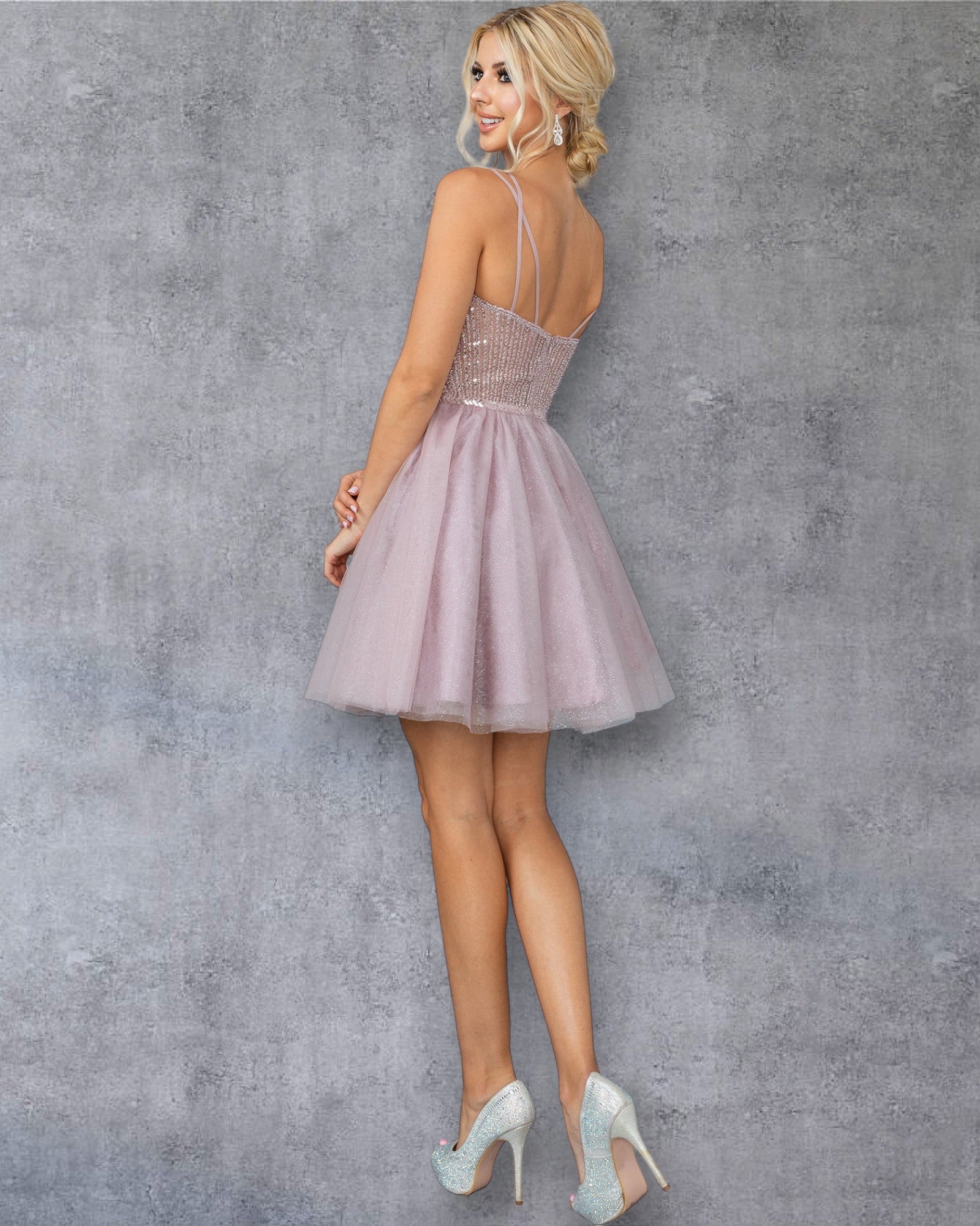 Vestido de fiesta sin mangas con cuerpo de lentejuelas, escote pronunciado y falda de tul