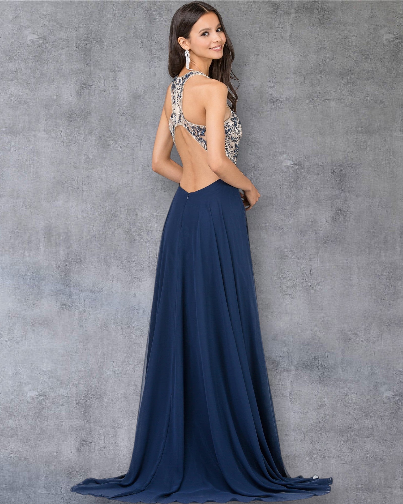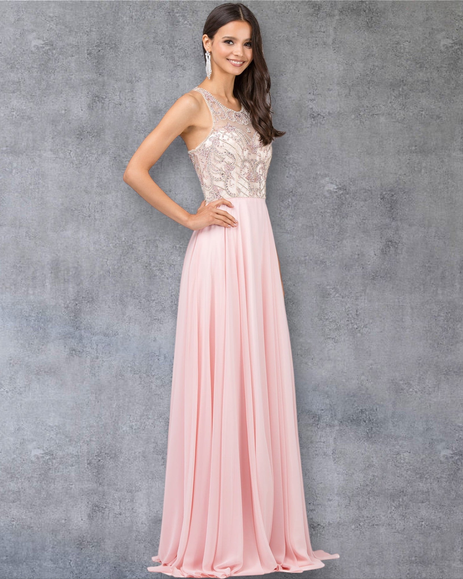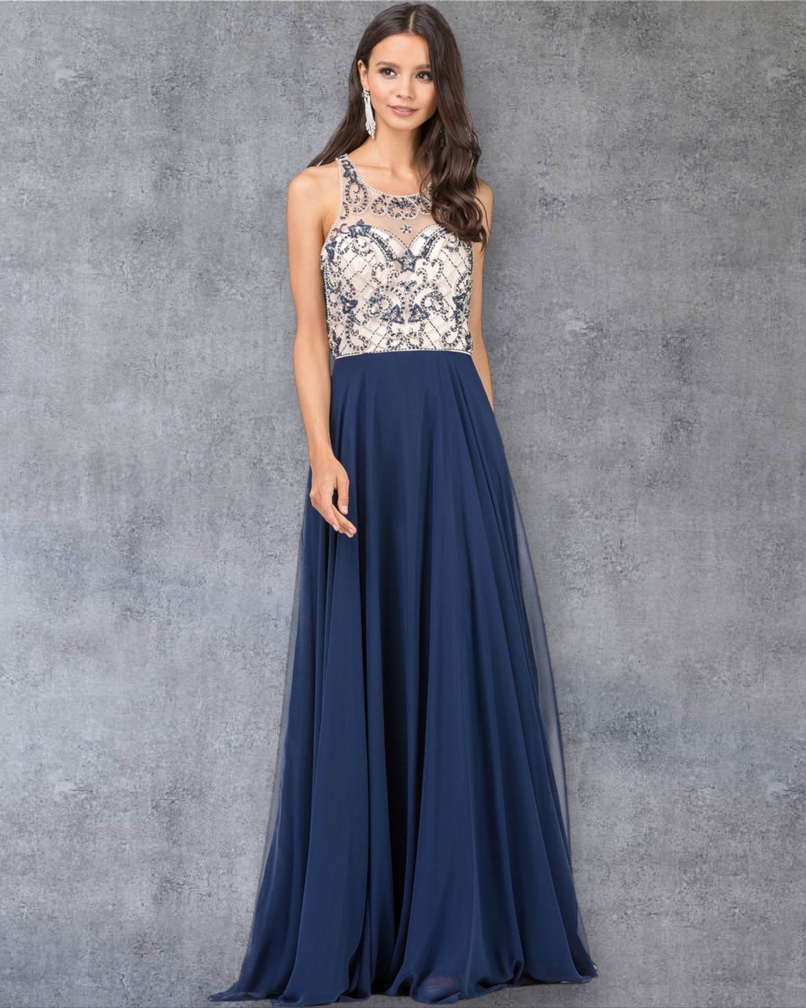 Vestido de fiesta sin mangas con escote joya y falda fluida en forma de A con corpiño bordado