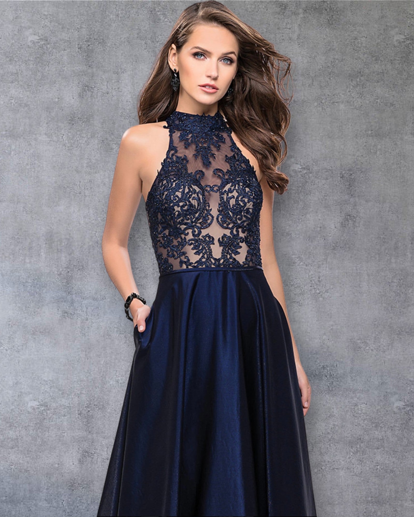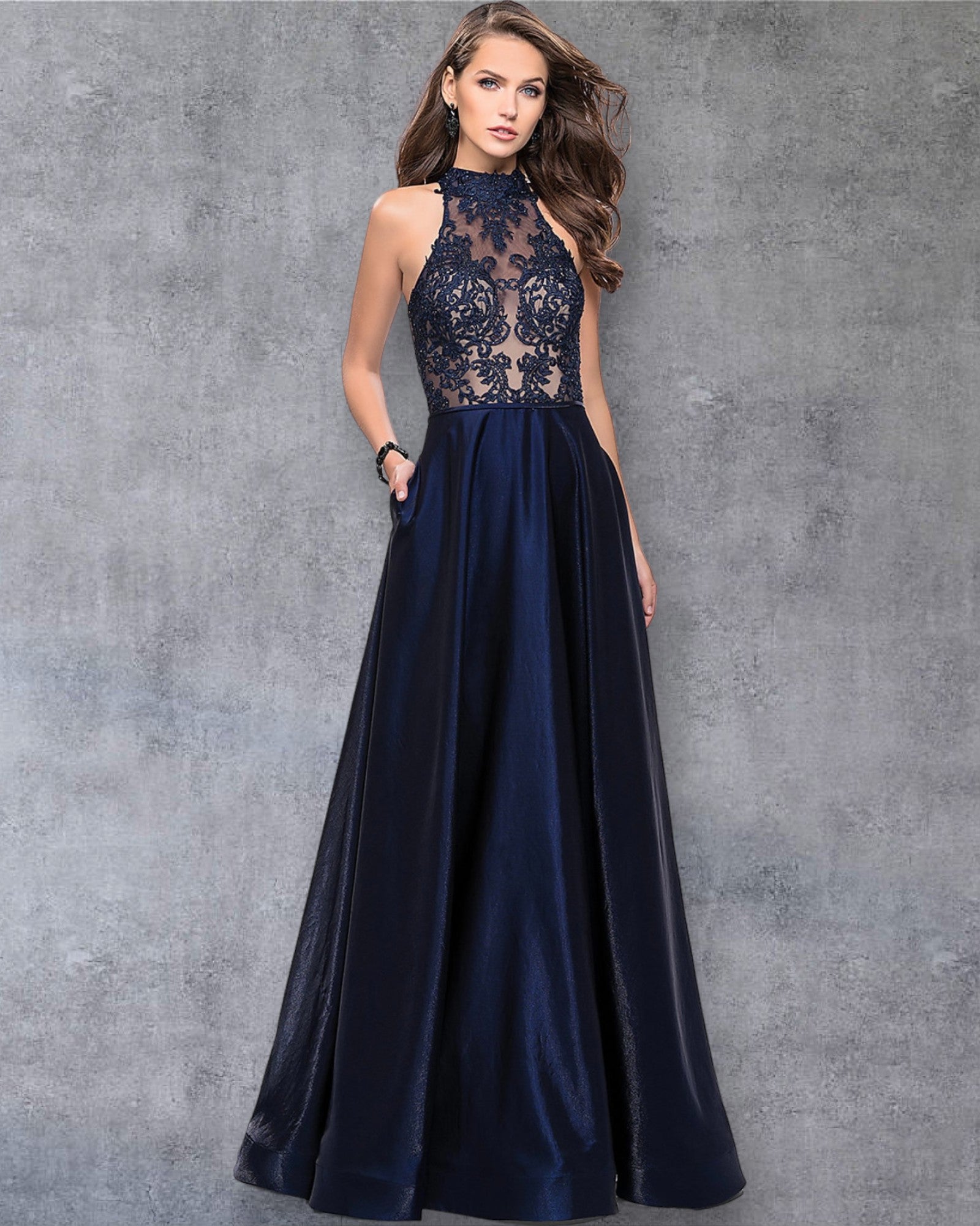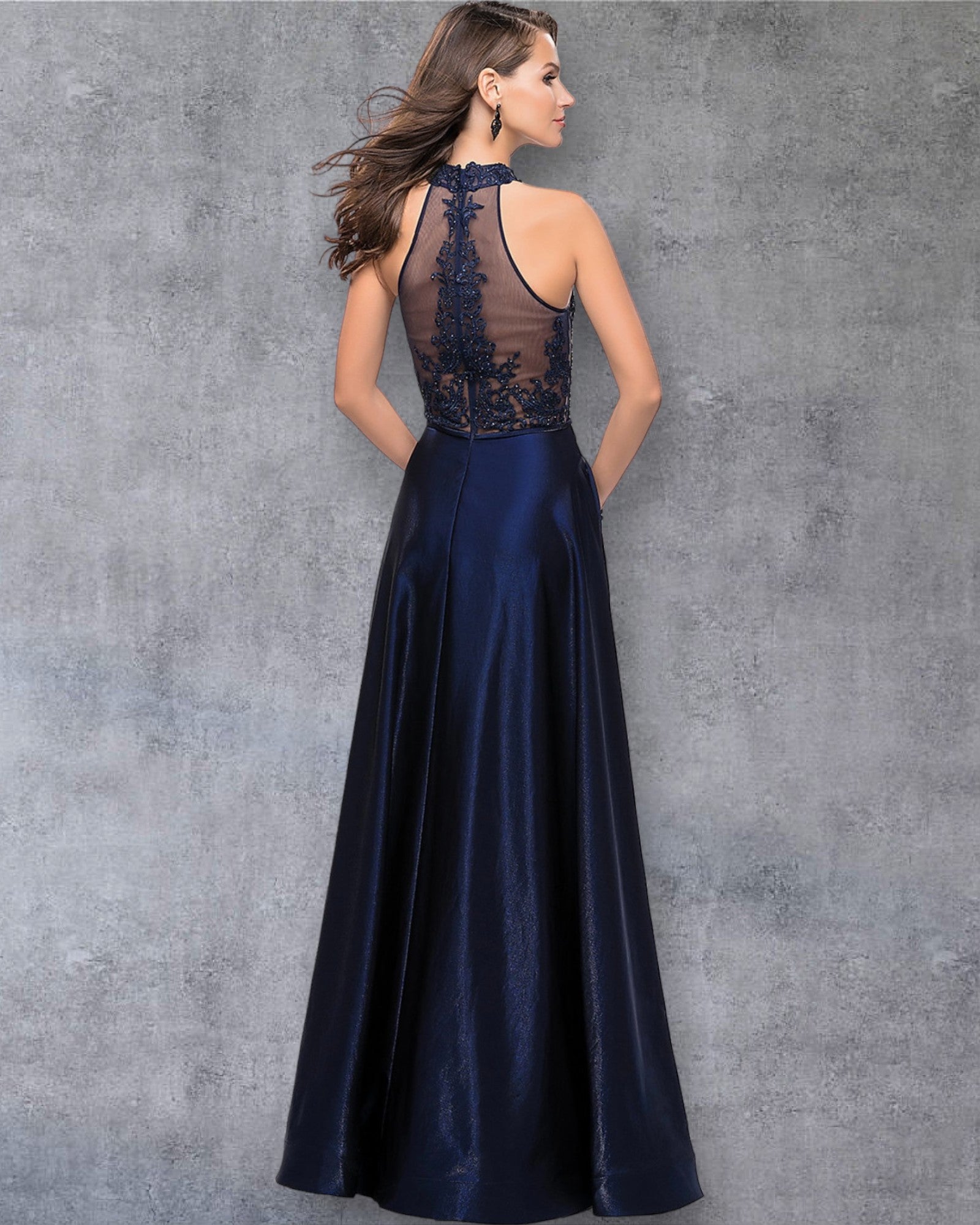 Vestido de Gala Azul Marino con Encaje Transparente y Escote Halter
