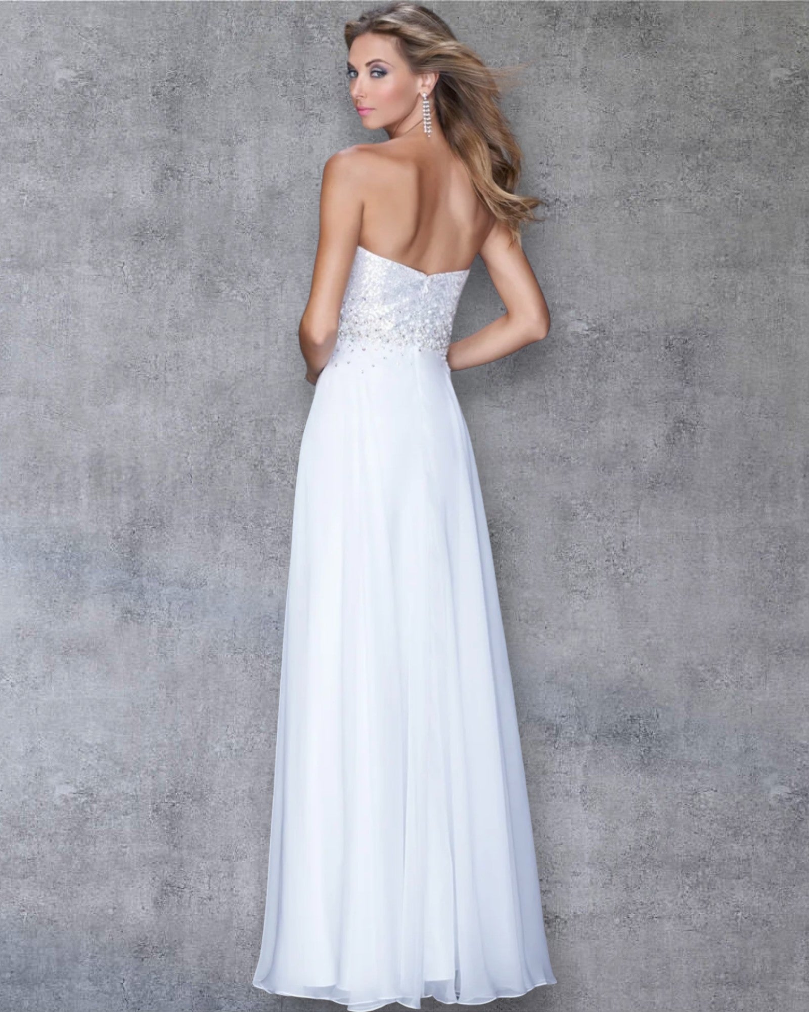 Este vestido de gala sin tirantes destaca por su delicado corset adornado con cristales brillantes que añaden un toque de glamour. Disponible en blanco, su escote corazón realza el busto, mientras que la falda de chifón cae suavemente, creando una silueta fluida y elegante. Perfecto para una boda, o evento especial, este diseño te hará lucir sofisticada y deslumbrante.