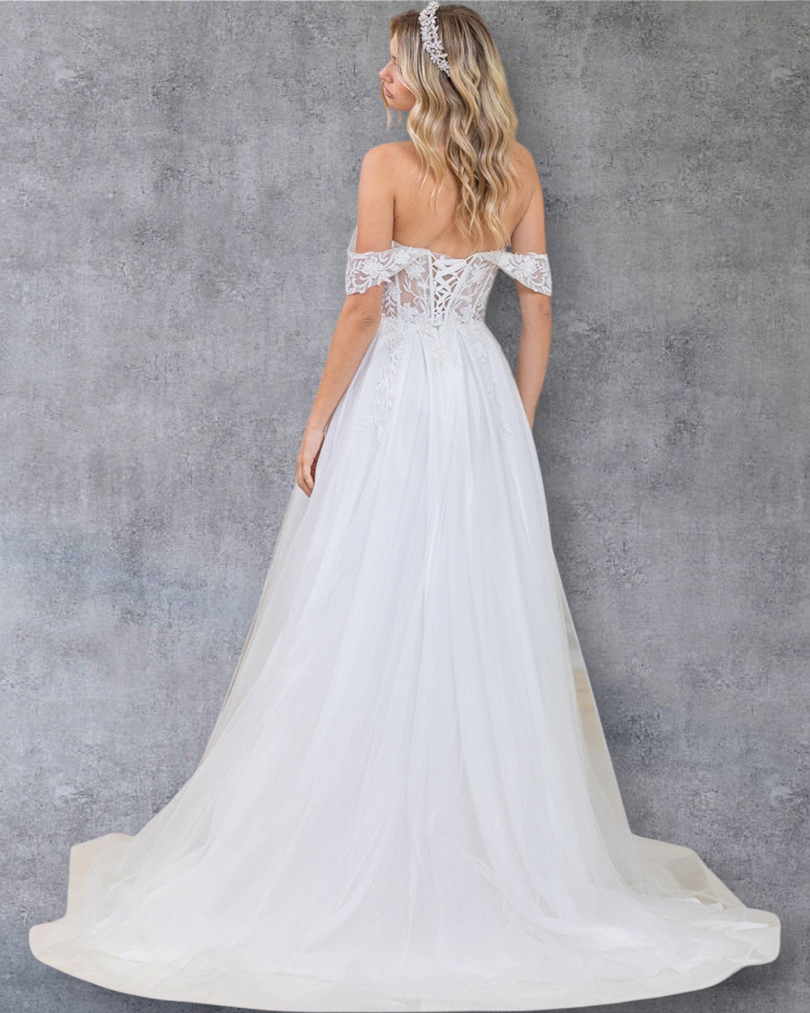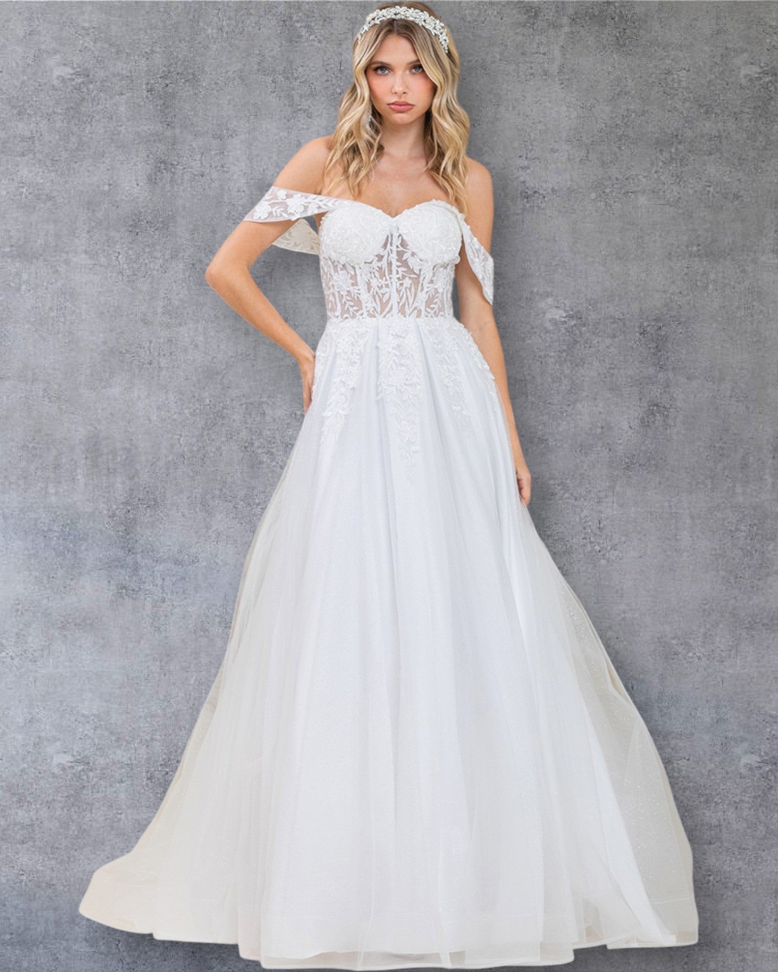 Vestido de novia corte A con hombros descubiertos, corpiño de encaje transparente, apliques florales y falda de tul