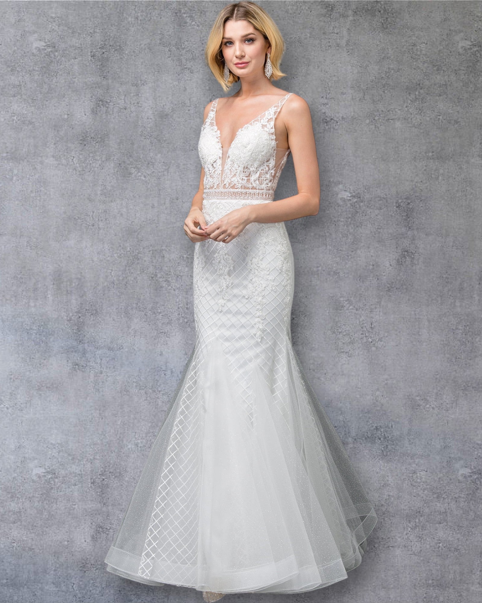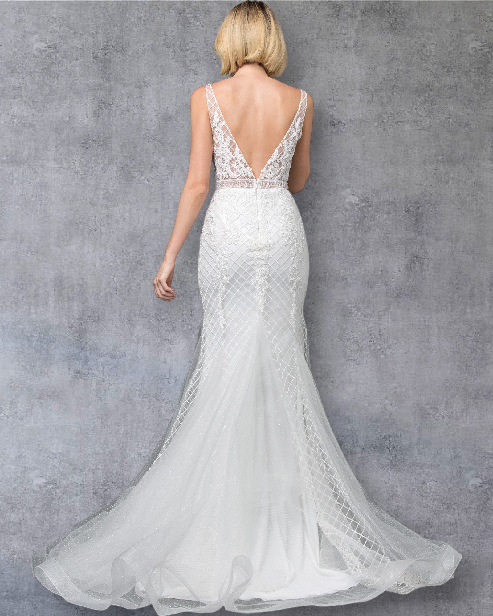 Vestido de novia de corte sirena contemporáneo con corpiño de encaje intrincado, detalle de espalda transparente y cola de tul en cascada