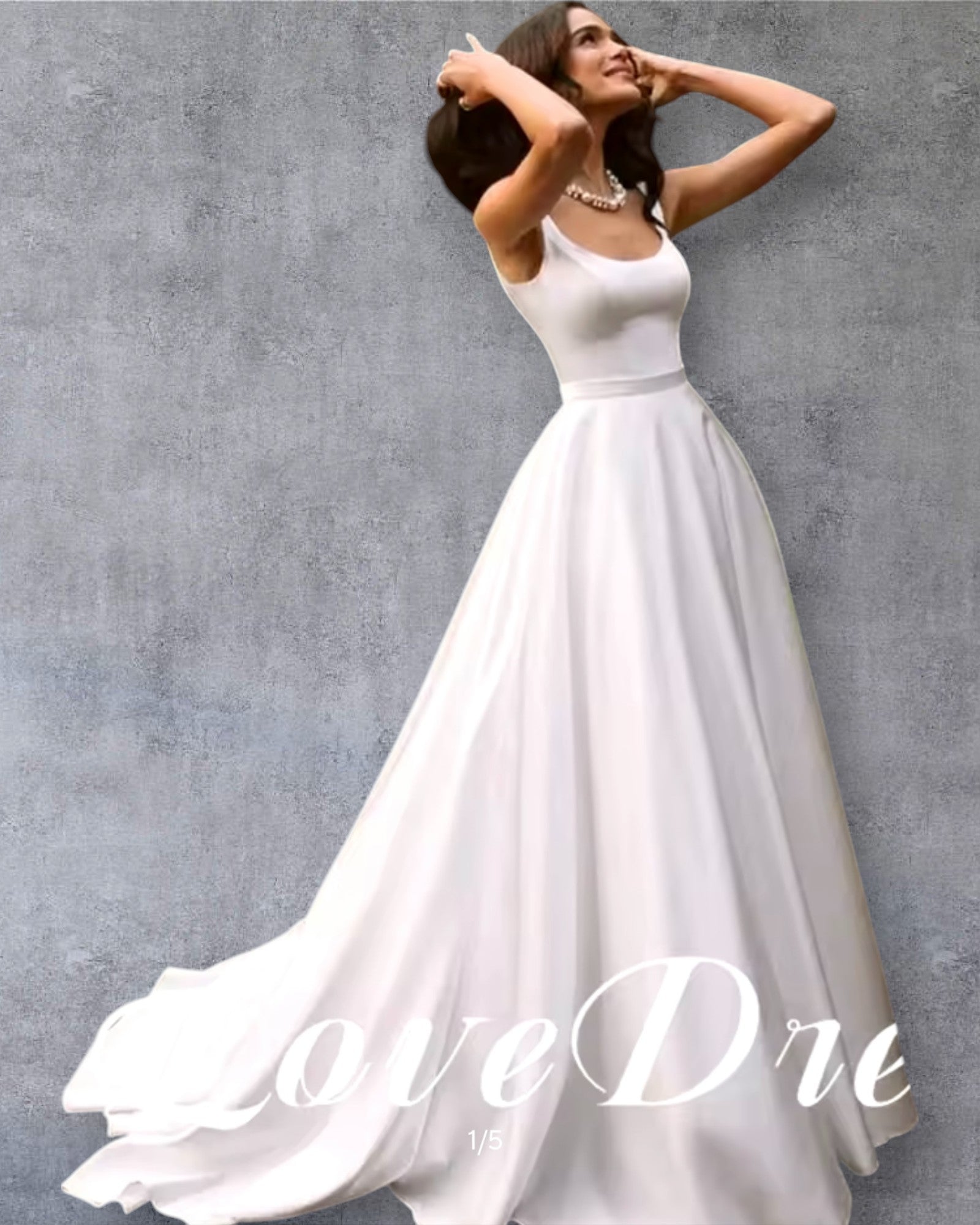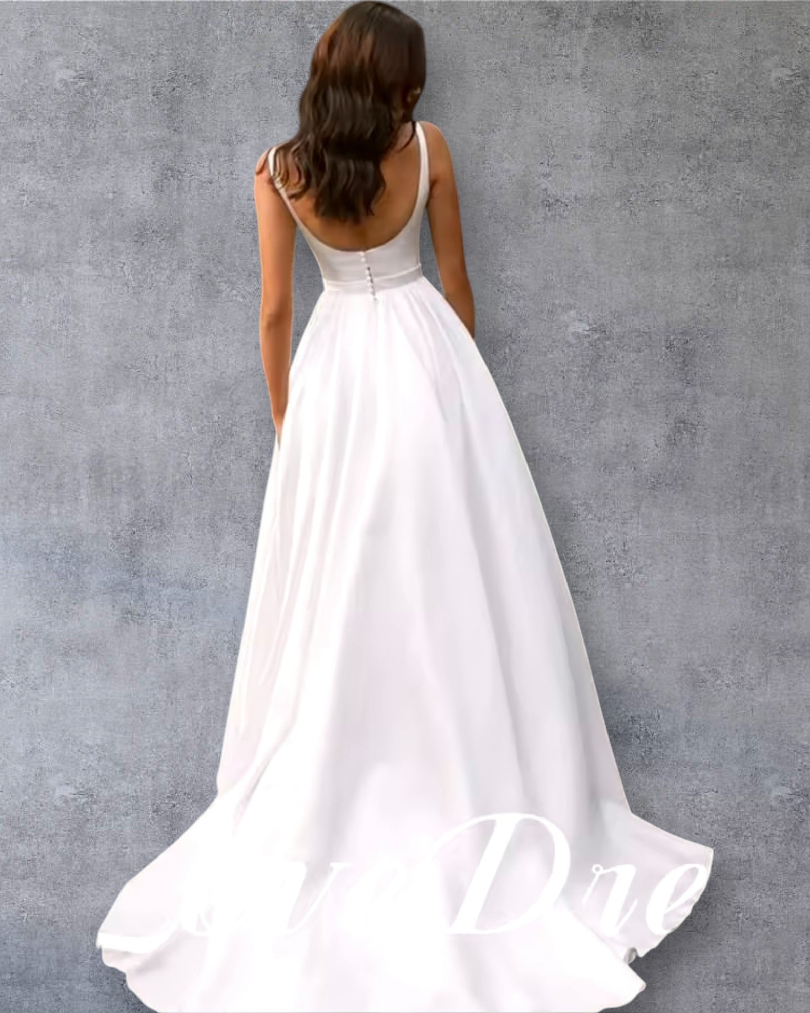 La belleza de la simplicidad cobra vida en este vestido de novia de inspiración minimalista. Con un elegante escote redondo, tirantes finos y una favorecedora espalda baja con delicados botones forrados, este diseño realza la figura con sutileza y gracia. La falda larga y vaporosa, confeccionada en tejido ligero de alta calidad, acompaña cada movimiento con un efecto etéreo y romántico. Ideal para novias que buscan un look sofisticado, fresco y moderno para bodas de día, ceremonias en la playa o celebraciones íntimas. Un vestido que demuestra que menos, es más.