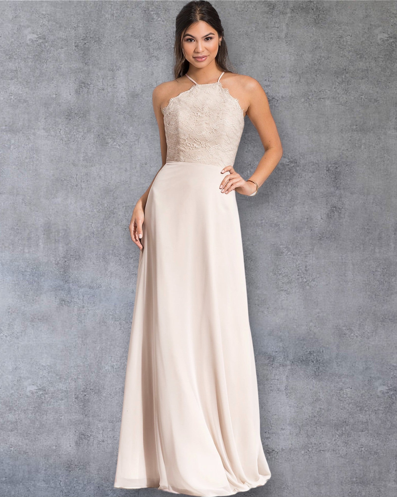 Vestido Largo de Fiesta con Escote Halter en Tono Crema
